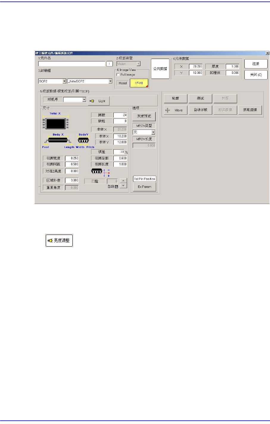 7-55 元件的登记 < 本体 Y> 编辑框 设定部品身的 Y 轴方向的尺寸。 < 误差 > 编辑框 输入部件数据的余量。 基本值为 30% 。 < 引脚宽度 > 编辑框 设定引线的宽度。 < 引脚间距 > 编辑框 设定引脚之间的间距。 < 引脚足部 > 编辑框 设定引脚接触到底面的距离。 < 引脚长度 > 编辑框 设定能显示到校正照像机的引…