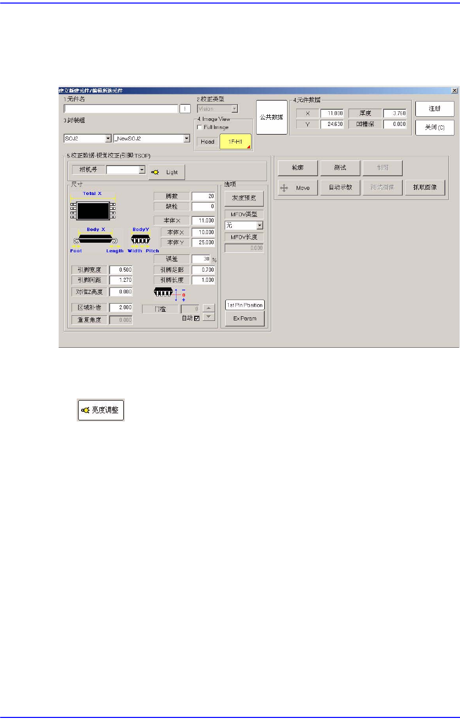 7-56 Samsung Componen t Placer SM431 Administrator’s Guide 7.1.3.4. SOJ2 部品的数据设定 设定有关 SOJ2 部品的排列数据。 图 7.20 “ 封装组 = SOJ2” 时的对话框 < 相机号 > 组合框 选择识别部品的摄象机。 详细事项请 参照 “7.1.1 共同识别 Data” 。 按钮 设定识别部品用摄象机的照明 度。 详细事项请参照 “7…