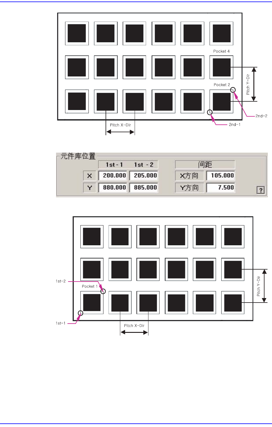 8-26 Samsung Componen t Placer SM431 Administrator’s Guide 2. 拼块设置方法请按下 面的顺序操作。 (1) 在右侧 纸卷轴对话框里选择 [1 盛料器有转角。 ] 功能。 (1 盛料器有转角。 ) (2) 首先请输入所有拼块的数量。 XN: X 方向的拼块总数 量 ( 列 ) YN: Y 方向的拼块总数量 ( 行 ) 注 意 请在确定拼块坐标前一定 " 要先 "…