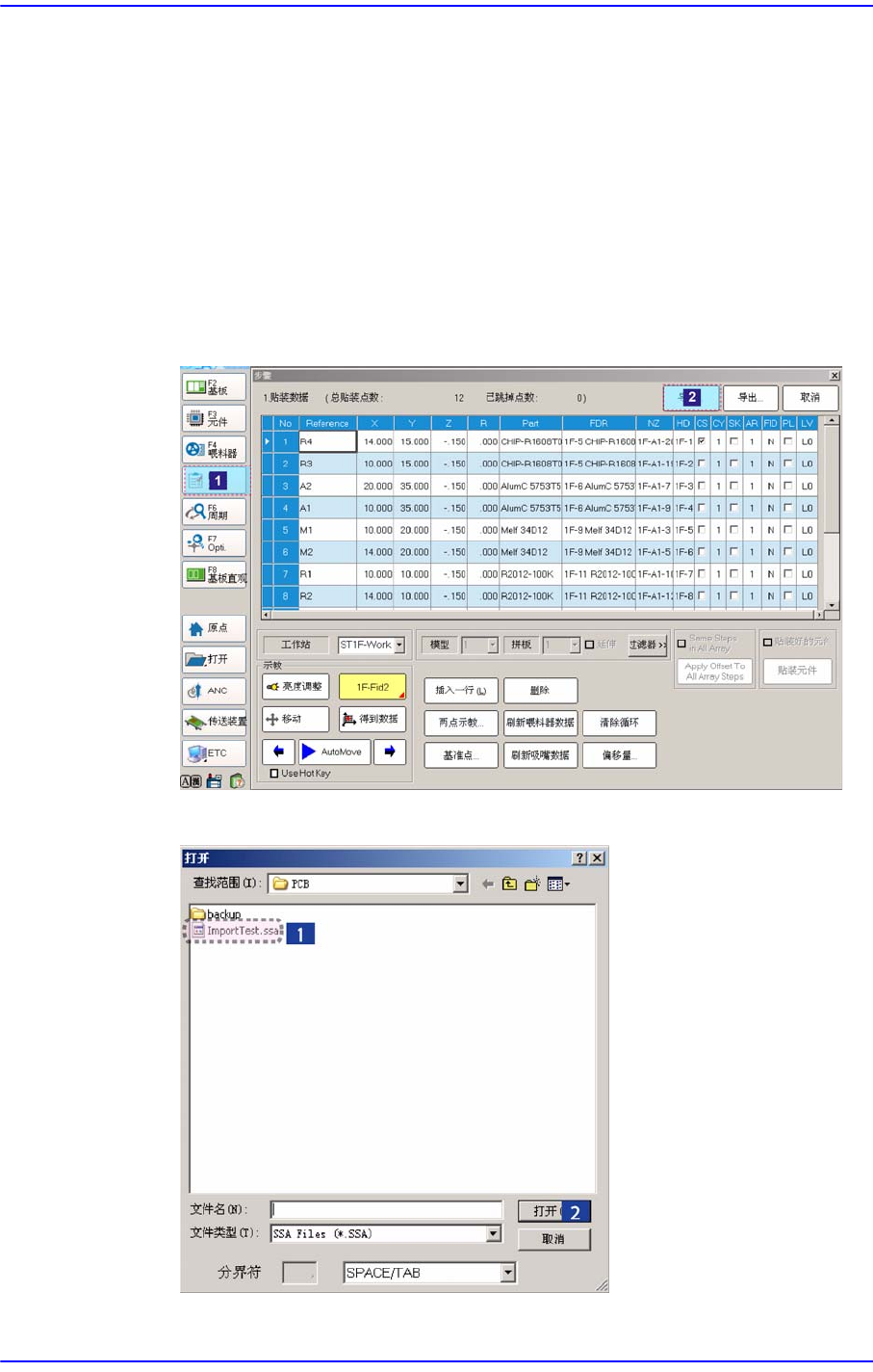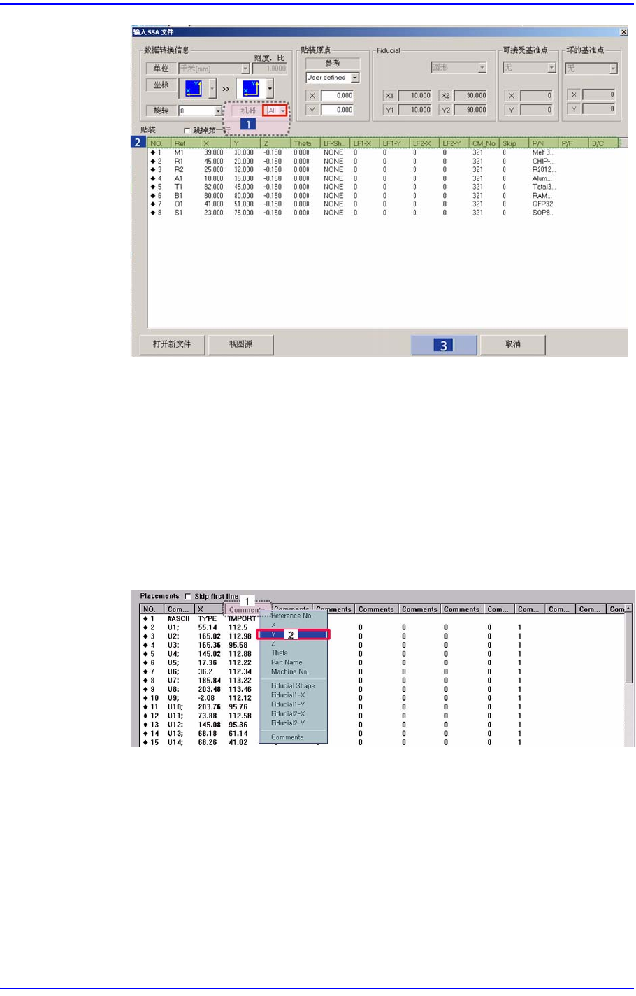 9-11 Step Programming 利用 Import 的 SSA 文件选择需要作业的设备 。 选择需要输入的设备 (Imported Machine) 。然 后 检 查 Placements 的列 (Row) 名 是否正确。 如果是本公司的标准格 式 (SSA Format) , 则不必更 改该列的值。 执行 < 转进 > 如果输入了本公司标准格式之 外的文件格式, 该列将如下显示 Comment 。 把鼠…