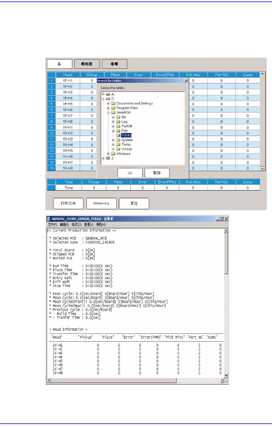 11-14 Samsung Componen t Placer SM431 Administrator’s Guide 11.1.4. 生产数据 < 打印文件 > 按钮 文本文档形式在指定的文件夹 (C:\SmartCM\Pdinfo) 保存 PCB 生产有关 的贴装信 息。 <PPM<->%> 按钮 转换表示的单位。 (PPM<->%)