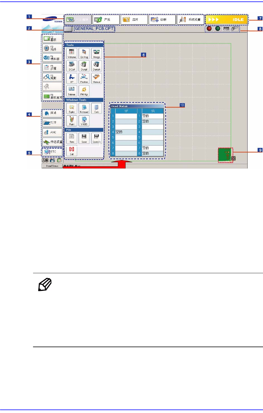 Samsung Component Place r SM431 Administrator’s Guide xiv 1: 表示主菜单工具栏。 2: 显示正在操作中的 PCB 文件名。 3: 显示子菜单。 4: 显示共同菜单。 ( 原点 , 打开 , ANC, 传送装置 ) 5: 显示 ‘ETC’ 菜单时选择 . 6: 显示 ‘ETC’ 菜单 . (T ools, W indows T ools, File) 7: 显示当前设备的状态。 …