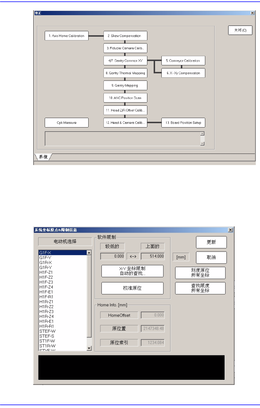 12-13 Machine Calibration 12.3. 校正 [F8] 用于执行与 XY Gantry 及 Camera 有关的校正 执行校正之前需要确认或先行的 作业为如下 I/O T est 检查 Mirror 上是否有杂质或 者是否发生了污染。 Nozzle Check 及 System Constant 的 V acuum Check Option Nozzle Check 及 System Consta…