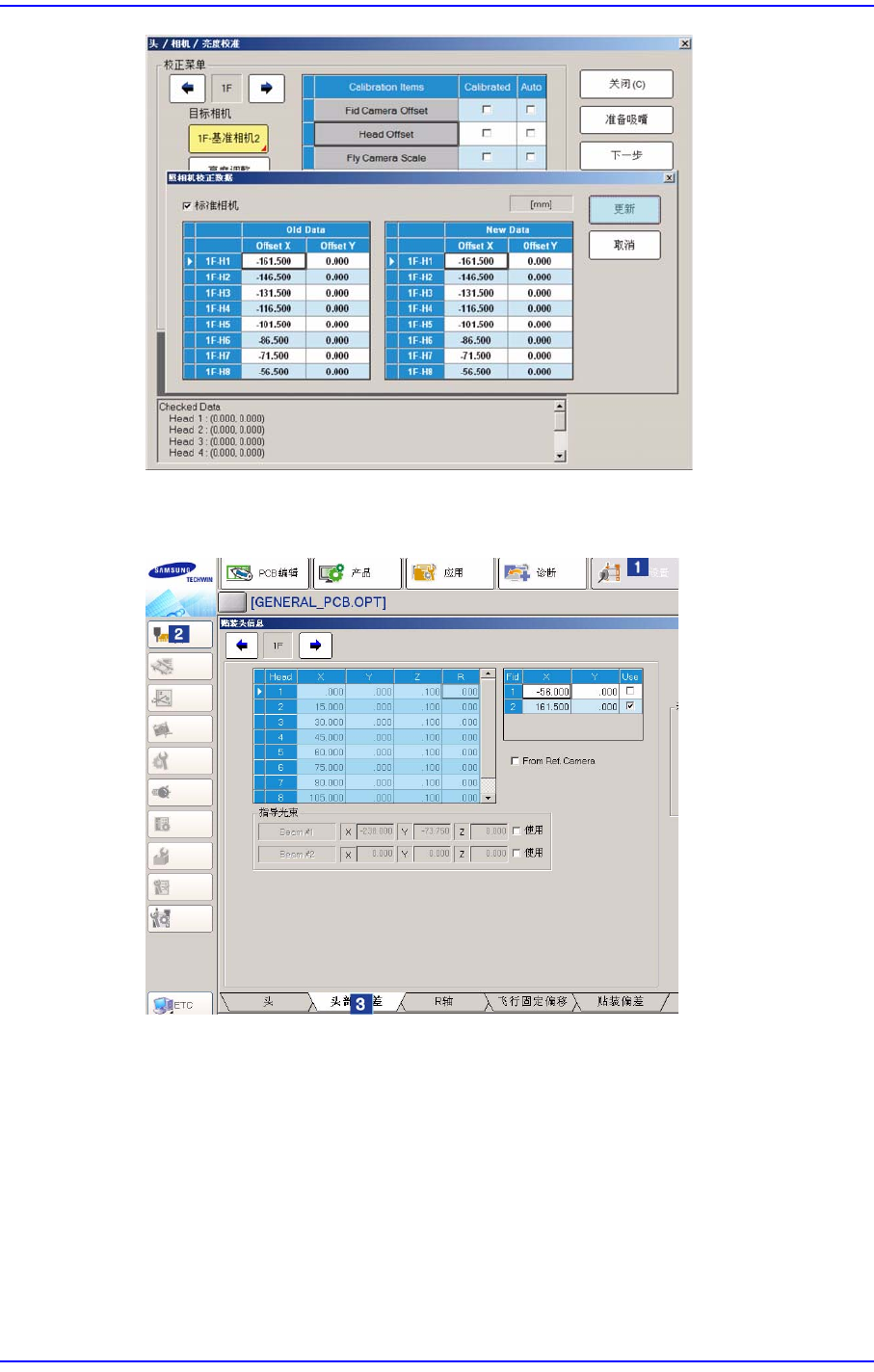 12-54 Samsung Componen t Placer SM431 Administrator’s Guide 7. 自动执行 Calibration 后完成 Calibration 则如下图显示结果 值, 请单击 < 下个 > 按 钮。 8. 显示 “ 下一 步, 把调整吸嘴从头 1 上卸掉。 单击 [ 下一步 ] 下移头 . \n 移动后, 用手 把调整吸嘴从头上卸下来。 ” 消息。 为了 在磁头 1 号的 吸嘴…