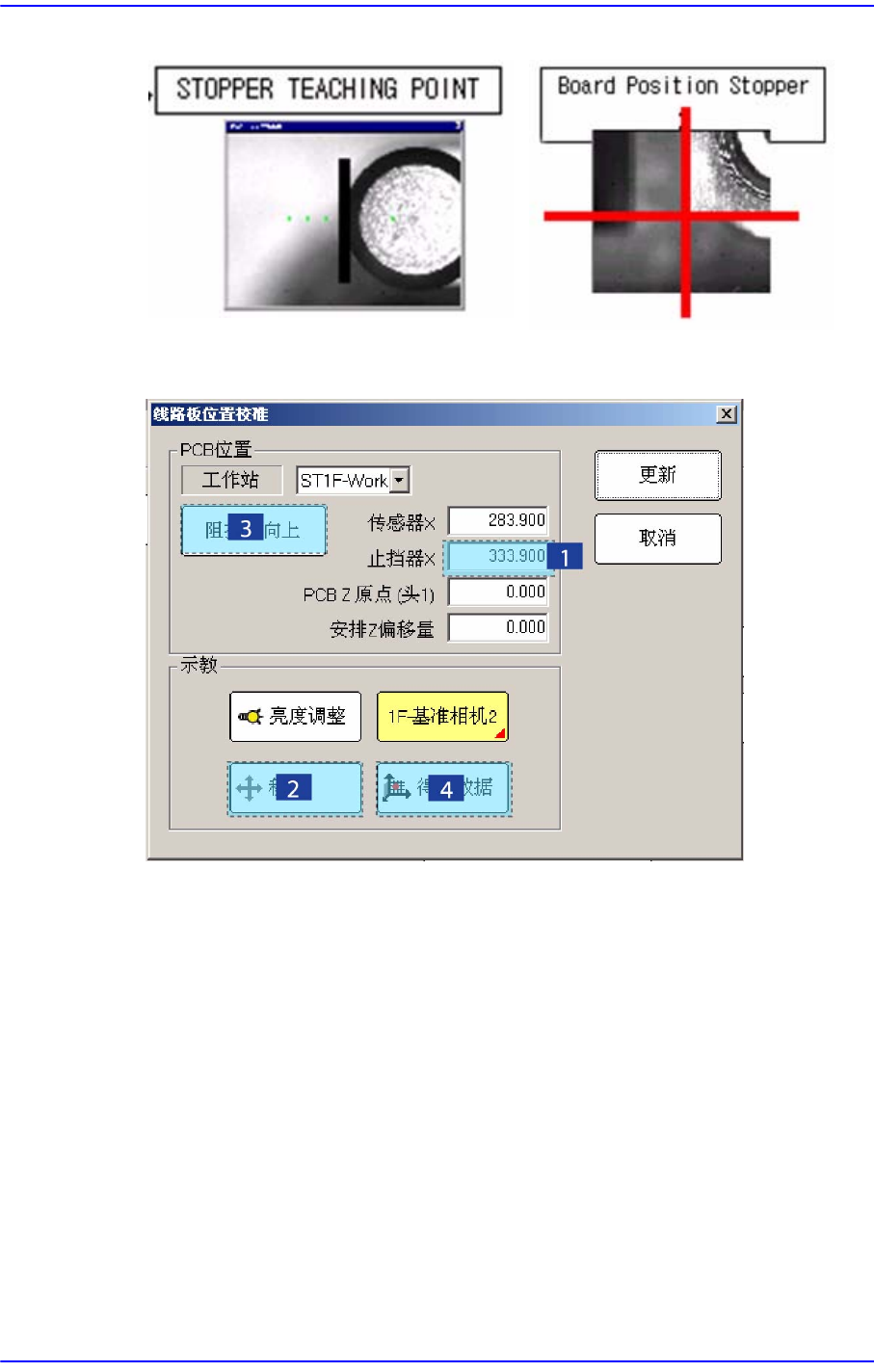 12-73 Machine Calibration 12.3.12. Board Positon Calibration 示教 Conveyor 贴装领域的 St opper 位置和 Sensor 的 X 位置。 以下是对 Board Position 进行 Calibration 的过程。 1. 用鼠标选择 < 传感器 X> 编辑 箱, 单击 < 移动 > 按扭, 把示教相机移动到 Sensor X 位置。 2…