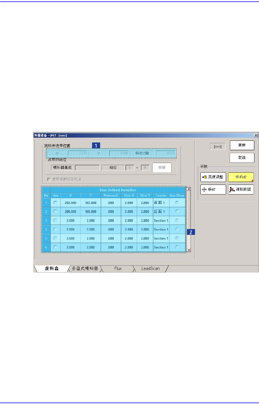 13-7 系统设置 13.2.2. 废料盒 设定与吸附部件回收厢 Dump Box 有关的数 据。 图 13.6 “ 系统抛料位置 ”TAP 对话框 < 系统默认垃圾箱 > 领域 输入系统回收箱位置。 Dump Box 选择用箭头键 1F : 显示出当前选定 的 Dump Box 。 (1F :正 面 Gantry 、 1R : 背面 Gantry) 每个 Gantry 分配一个系统卸料箱。 单击箭头键后选择需要进行…