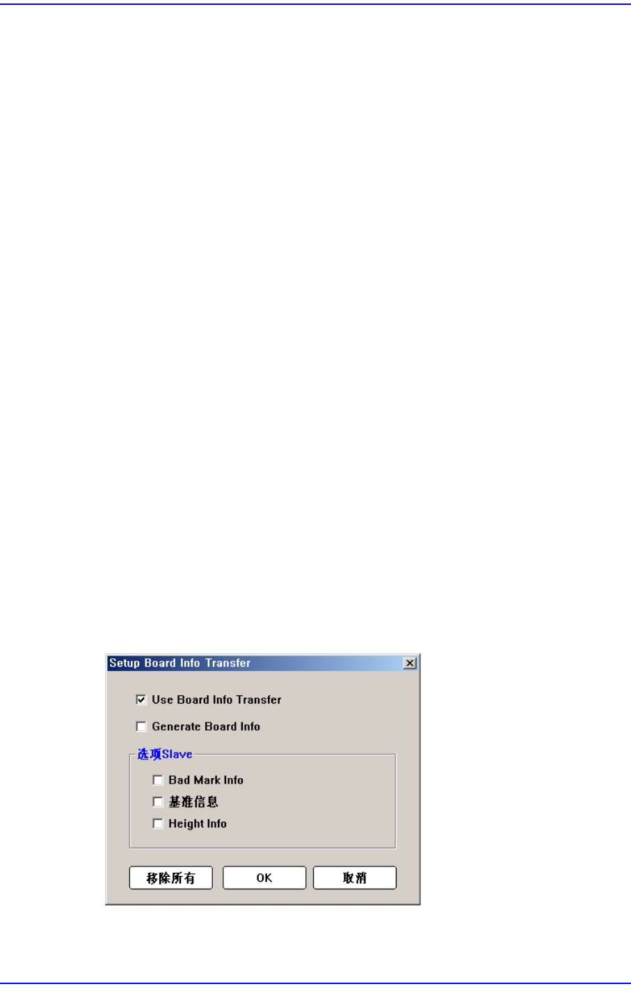 13-16 Samsung Componen t Placer SM431 Administrator’s Guide 需要使用来自上一个设备的板子 信息时圈选该复选框。 然后在激活的 < 选项 Slave> 区 选择需要使用的板子信息。 <Generate Board Info> 复选框 需要对传输到下一个设备的板子 信息进行设定时应圈选该复选框。 然后 在激 活的 < 选项 Slave> 区选…