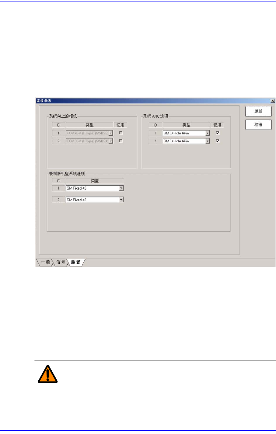 13-21 系统设置 红色灯灭灯时 设备在 EMERGENCY 状态下, 作业中发生 Emergency 故障设备处于停止状态。 13.4.3. 装置 设定 ANC , 照相机的使用与否, 设定视觉 系统能使用的参数。 选择此按钮时显示 如 下的画面。 图 13.11 “ 装置 ”TAP 对话框 < 系统向上的相机 > 领域 设定设备中使用的固定相机的使用 与否后选择 Ty p e 。 使 用相应的固定相机时, 选择…