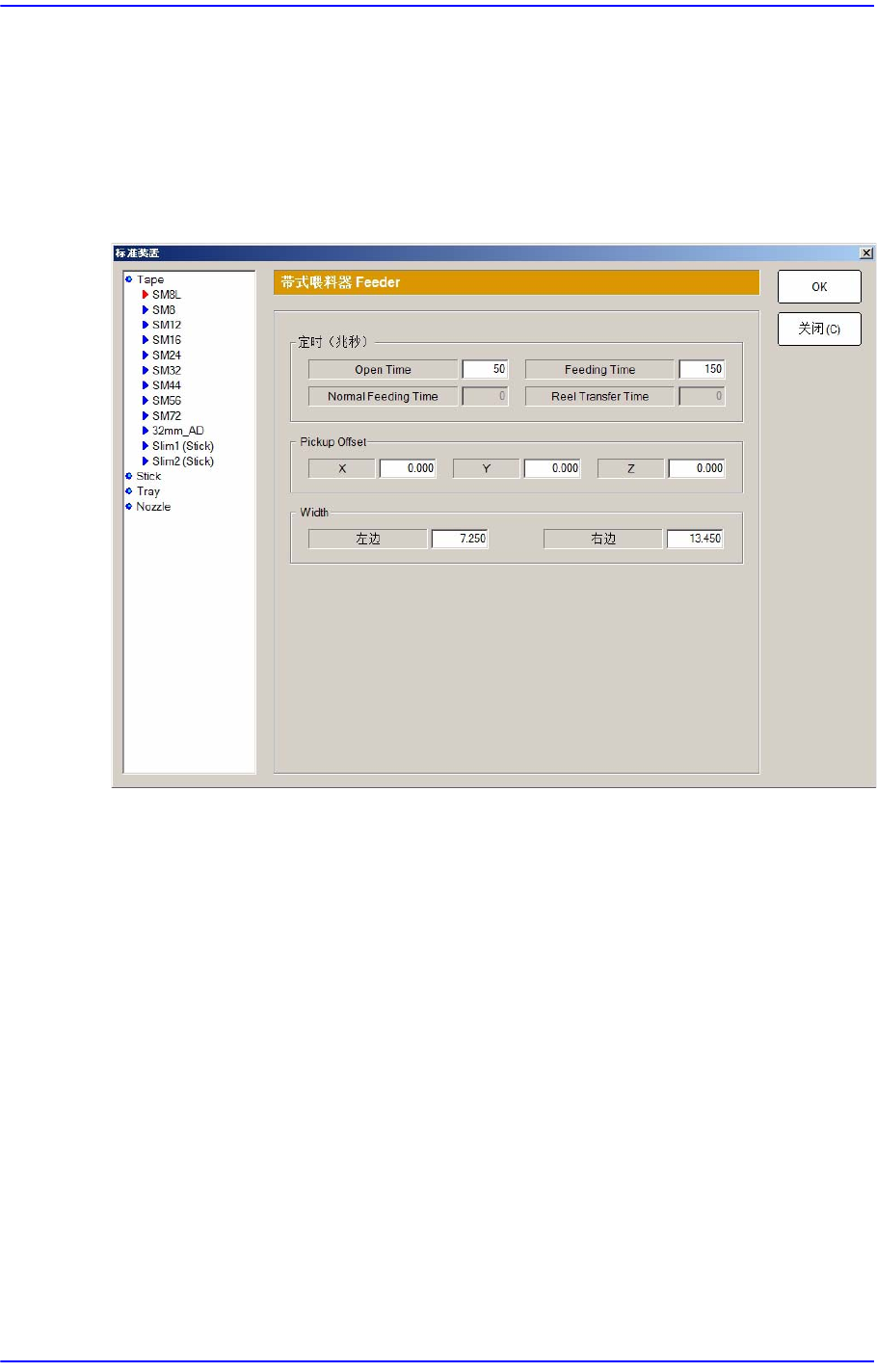 设置对带式喂料器的吸附点的偏移。以带式喂料器安装在设备正面为基准对8毫