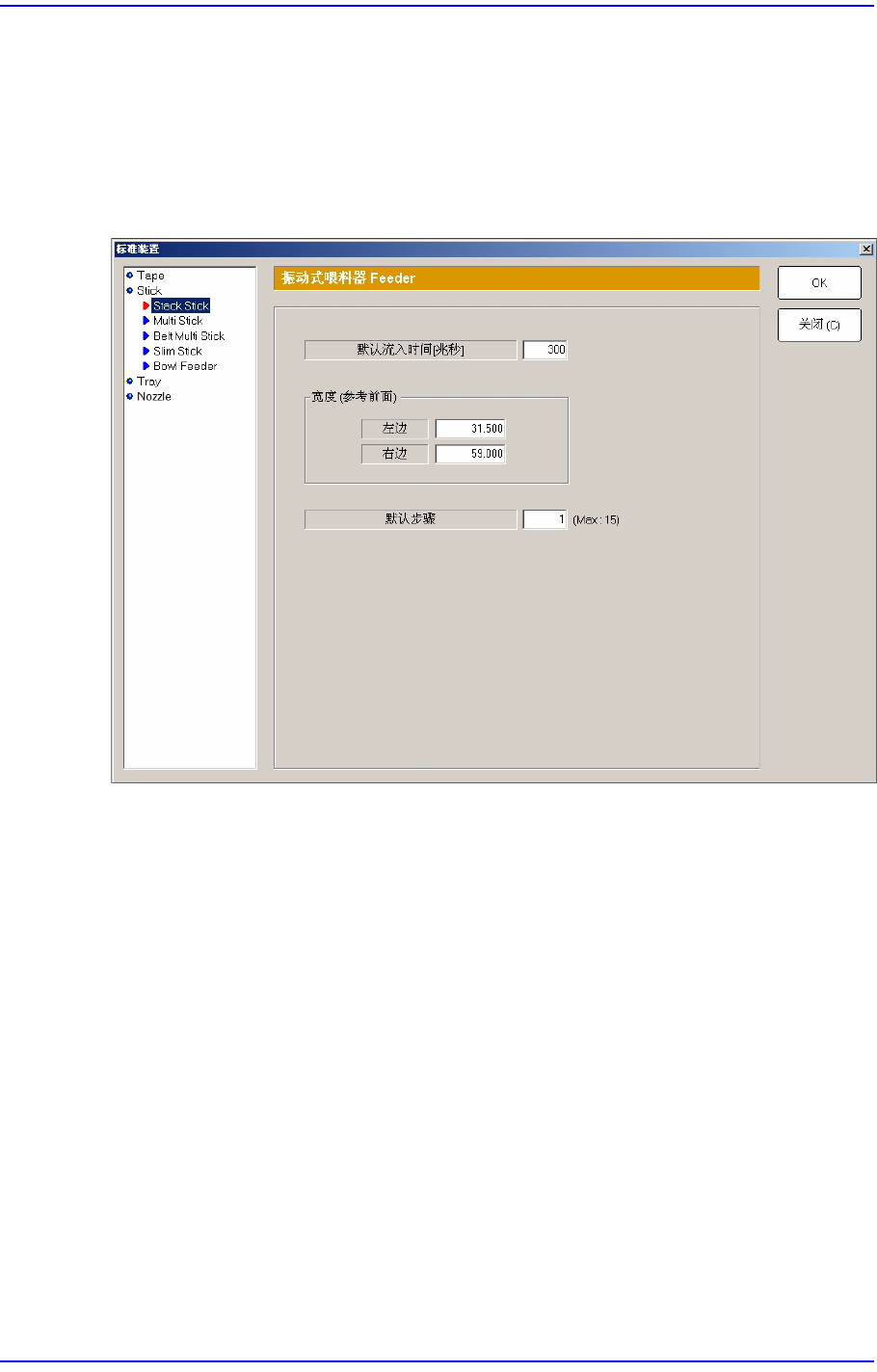 13-23 系统设置 在 Feeder Base 所占的空间。 13.5.2. 振动式喂料器 以下画面是在目录框中选择 “Stick” 时。 设定有关管式喂料器 的数据。 图 13.13 “ 标准装置 – 管式 ” 对话框 目录箱 选择将要设定的管式喂料器形式。 < 默认流入时间 [ 兆秒 ]> 编辑框 设定推料时间。 < 宽度 ( 参考前 面 )> 领域 < 左边 > 编辑框 设定管…