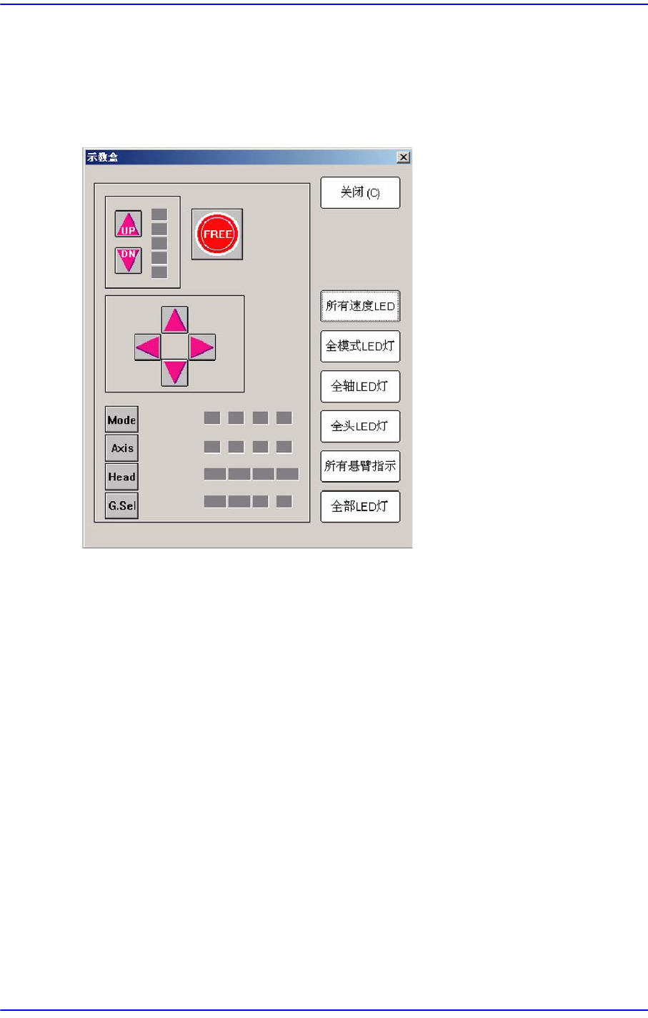 14-10 Samsung Componen t Placer SM431 Administrator’s Guide 14.5. 示教盒 (Teaching Box) [F6] 检查 T eaching Box 的 动作。 单击此按钮显示如下的对话框。 表示 实际操作当中 T eaching Box 的各按钮的动作状 态。 图 14.8 “ 示教盒 ” 对话框 < 所有速度 LED 灯 > 按钮 开 / 关全部 速度 …