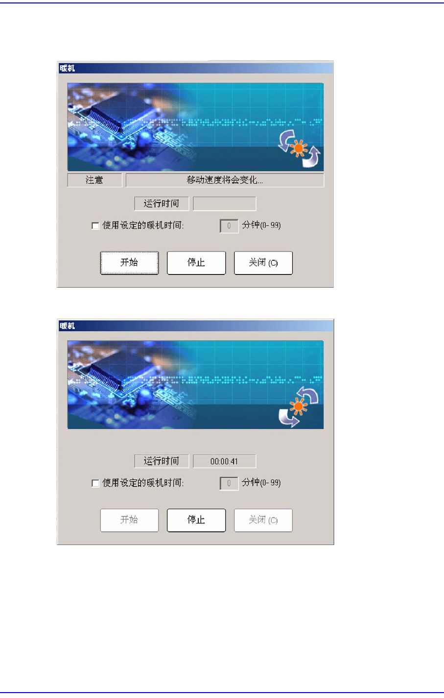 开始变暖动作。单击此按钮时开始预热动作的同时在“变暖”对话框上显示所运