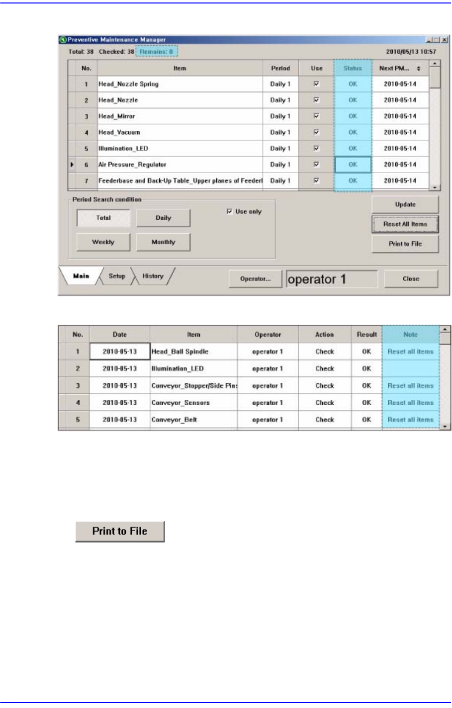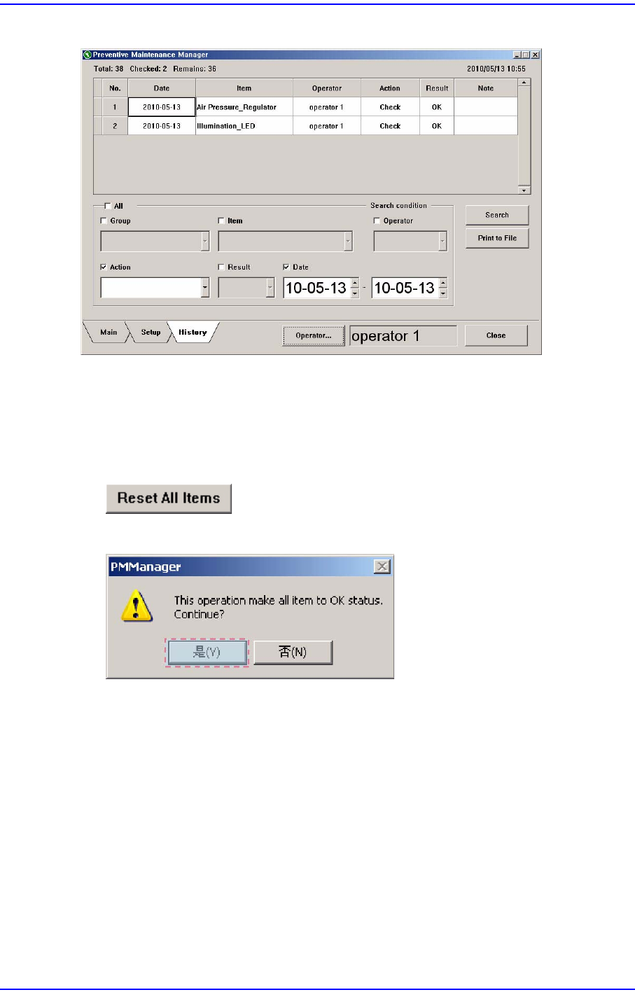 17-7 PM Manager 图 17.6 History 中查看检查措施内容 17.4.6. 所有的查项目变更为检查完成 (“OK”) 状态 所有的检查项目可以一次性改变 为已完成检查的状态。 方法如下 . 点击 <Reset All Items> 按钮 出现 PMManager 对话框时点击 < 是 (Y)> 按钮 . 如上进行设置时 Main 画面的所有项目改变 为检查完成的状态的同时需要检查 的…