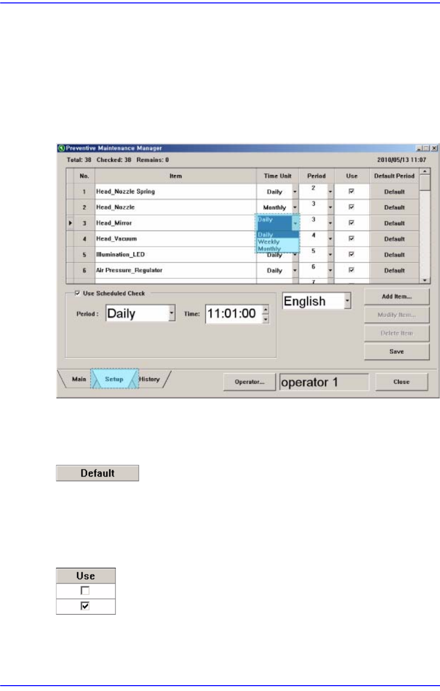17-10 Samsung Componen t Placer SM431 Administrator’s Guide 17.5. Setup 画面 17.5.1. 更改检查周期 各检查项目的检查周期可在 Setup 画面中进 行更改 . 如下图需要更改检查周期的 Item 的 Ti m e U n i t 项目中点击组合框按钮后更改检查周 期 (日 、 周、 月) . 图 17.9 更改检查周期 17.5.2. 检查周期初始化 更改的…