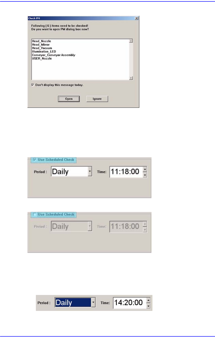 17-14 Samsung Componen t Placer SM431 Administrator’s Guide 图 17.13 预约检查提示画面 点击 <Open> 按钮时显示可措施检查项目的 PM Manager 窗口, 点击 <Ignore > 按钮时 不显示 PM Manager 窗口 . 17.5.8.1. 预约检查功能的使用 使用预约检查功能时, 选择 <Use Scheduled Che…
