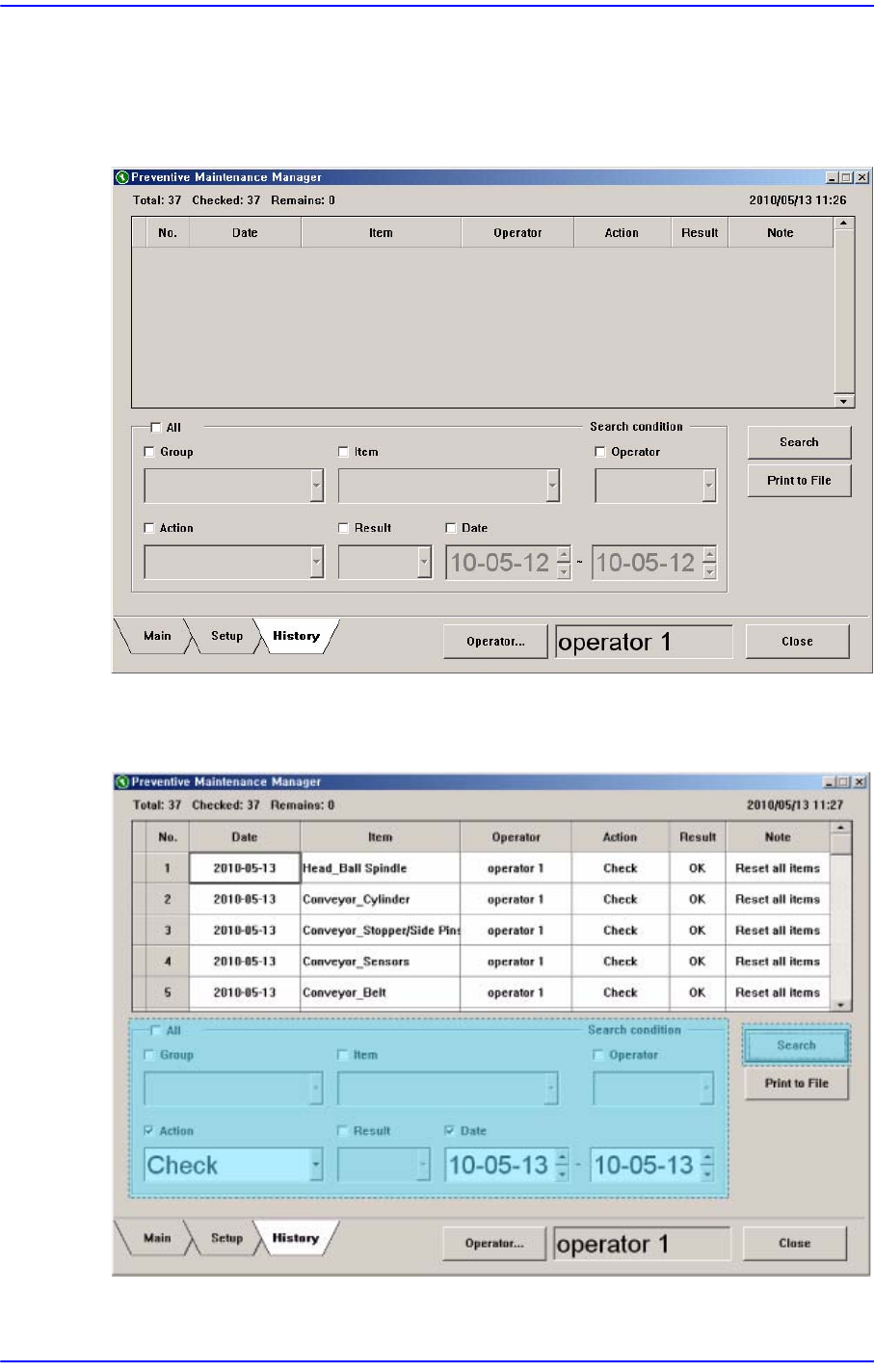 17-16 Samsung Componen t Placer SM431 Administrator’s Guide 17.6. History 画面 在 History 画面中可查看所有检查记录 . 图 17.14 History 画面 查看检查记录时, 输入检查条件后点击 <Search> 按钮 . 图 17.15 检查记录查看画面