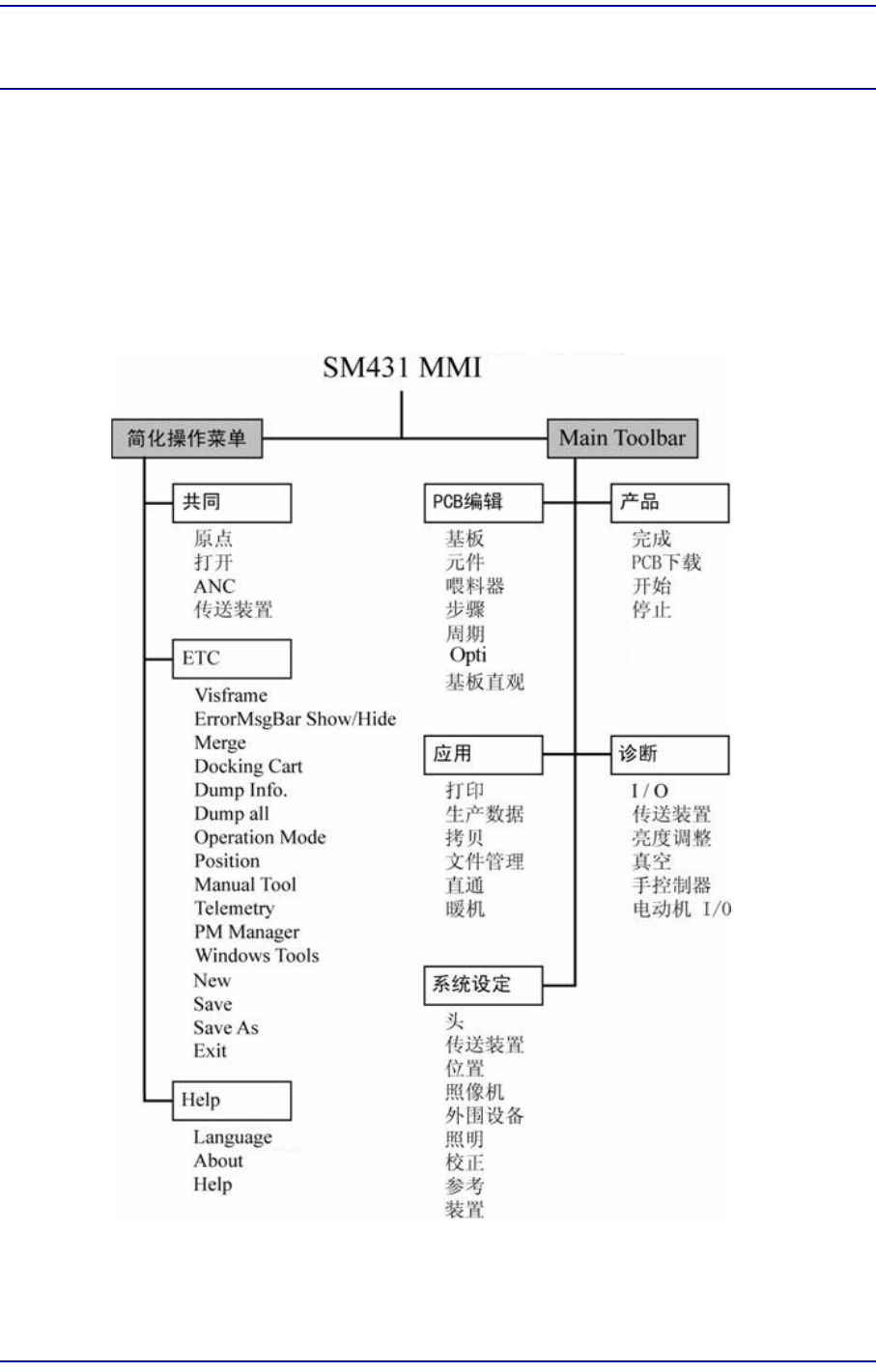 2-2 Samsung Componen t Placer SM431 Administrator’s Guide 2.1.2. 功能一览表 本章节主要介绍有关本设备的应用 程序 MMI 的主画面上所显示的所有菜单的内 容。 2.1.2.1. 简化操作 (shortcut) 菜单的子菜单 2.1.2.1.1. 共同菜单工具栏 原点 (Origin) 运行设备 X,Y , Z, Theta(R), Mirror 轴发动机的原点恢复 (…