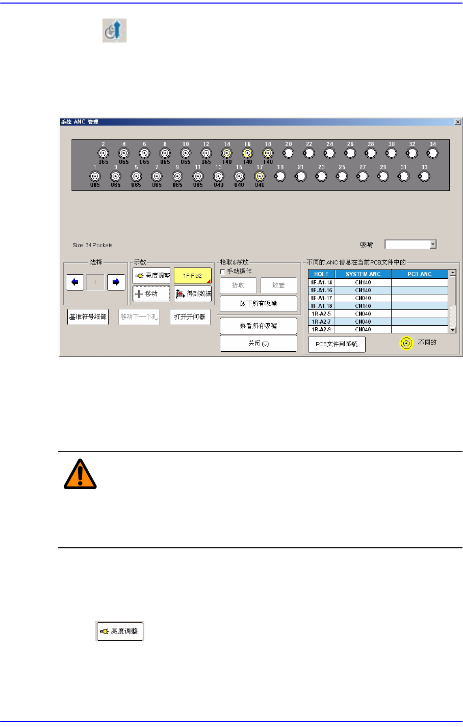 警 告 如果需要手动配置吸嘴,使用<打开开闭器>按钮打开ANC开