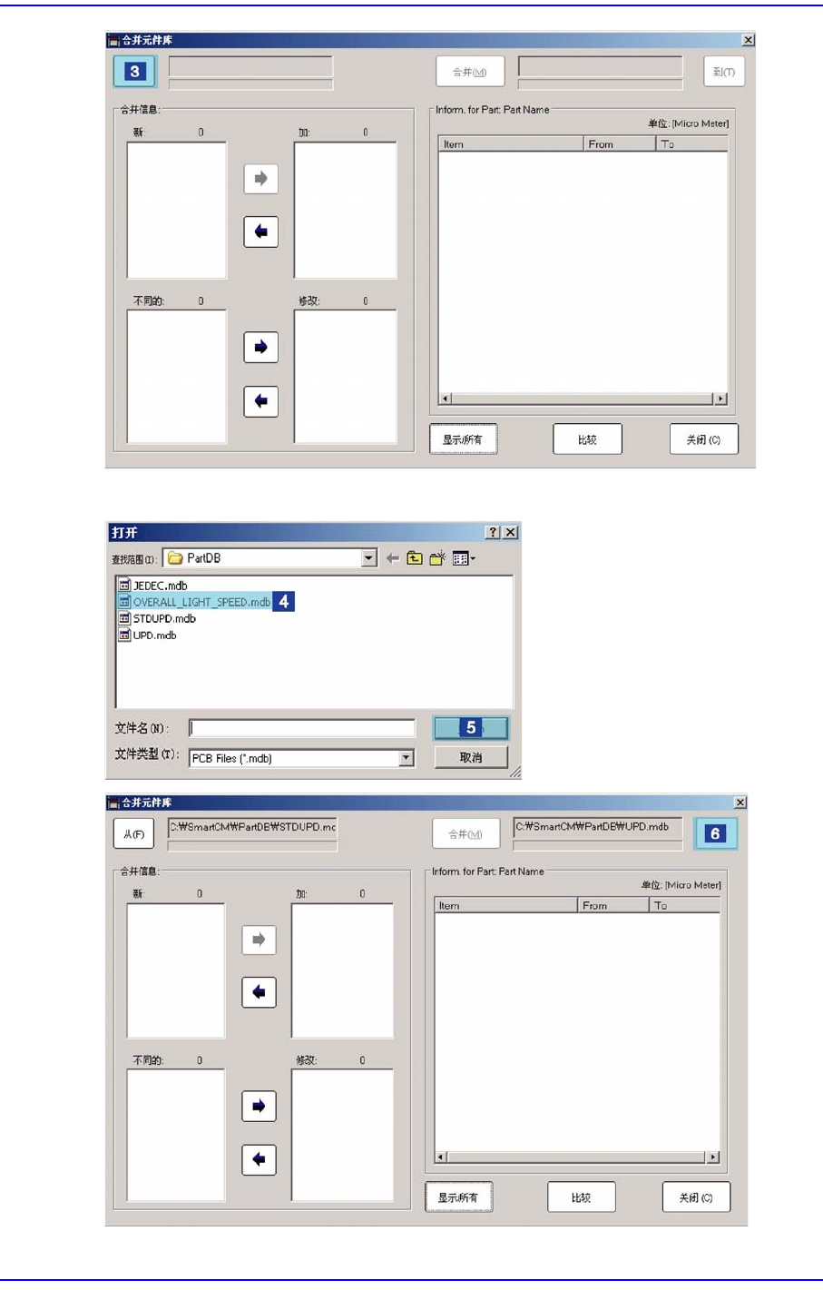 在〈 新:〉目录框或〈不同的:〉目录框选择要合并到Target DB文件的部件信息并