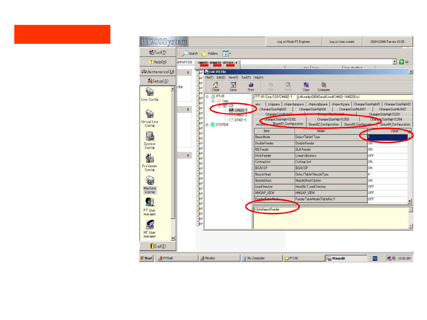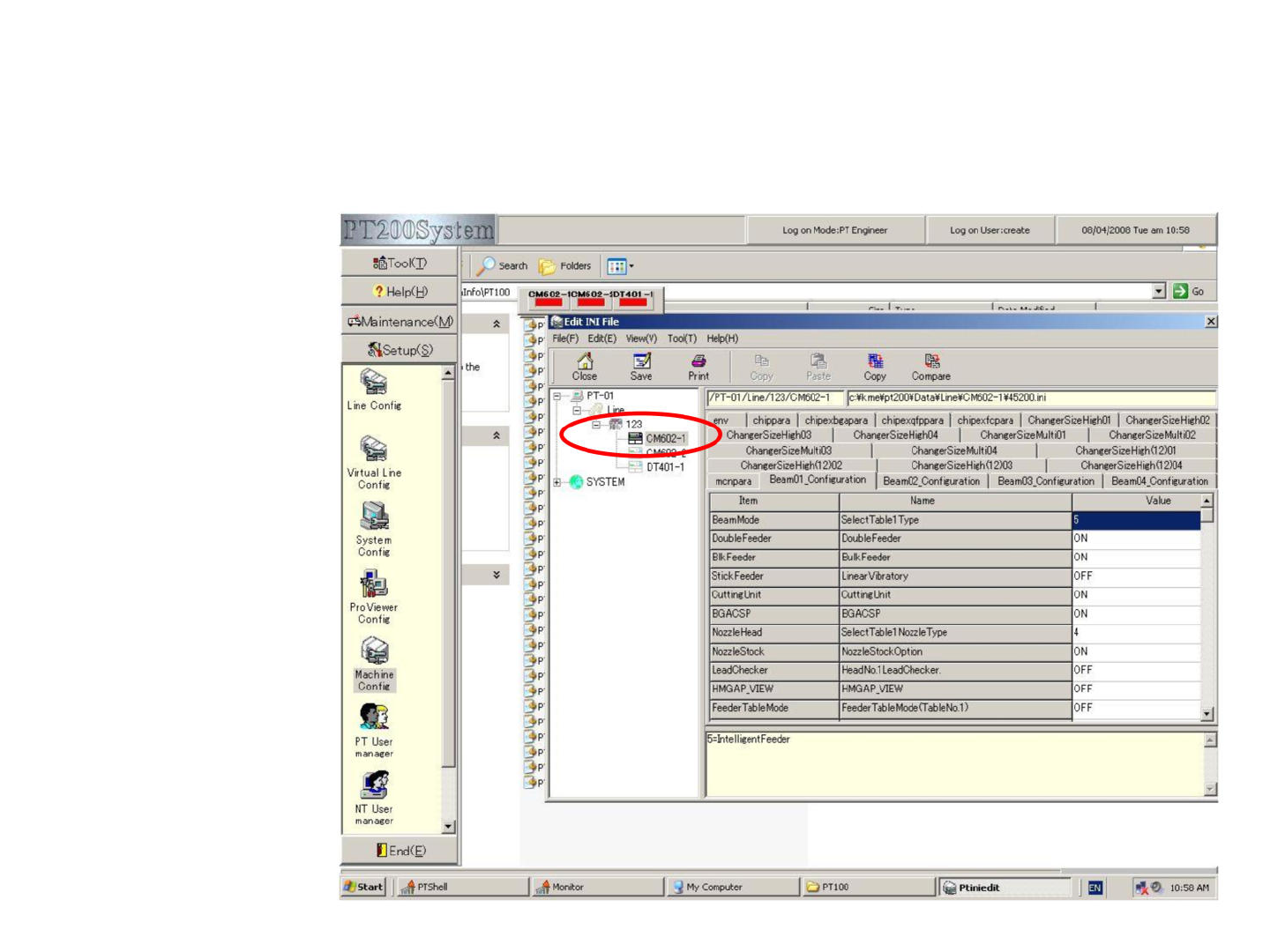 4. 有关机器配置的一些设置 点击菜单中的 setup ,打开 Machine config 。 单击我们设置的 Line 后,可看到 前面我们添加的 机器,逐个点击 进去进行设置。 i Start | 陷 PTShell Monitor My Computer 匕 PT100 I |'虚 Ptiniedit 间 吸② 10:58 AM