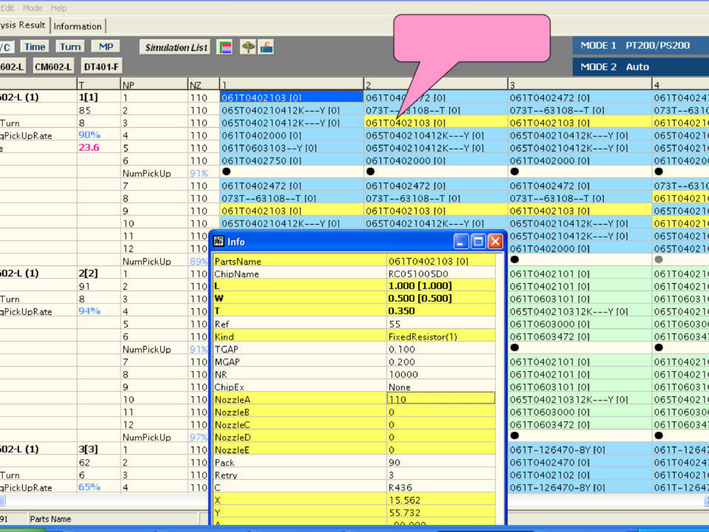 双击出现使用相同 料号的分布情况 Edit Mode Help ysis Result Information \ z / / : 6 勺 Time; | Turn | MP Simuf-atim Lisi | mini MODE 1 PT200/PS200 02-l| | CM602-L | DT401-F 1 MODE 2 Auto T MP NZ 1 2 / / 3 4 T J2 L (1) 1 L[ll 1 110 1 ).6 …