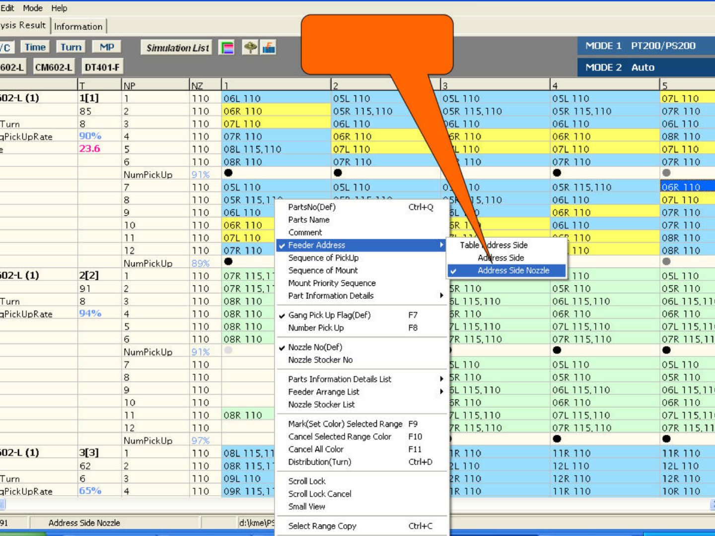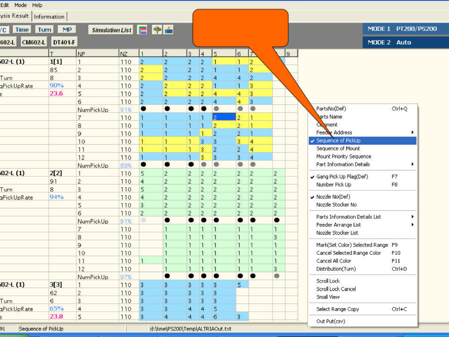 显示每个 turn 中 12 个头的 吸料顺序 Edit Mode Help vsis Result Information Simttf-atim LKl NZ ] 3 4 5 iO2 L (1) 85 2 110 T urn 8 3 110 qPickUpRate 4 6 no Ctrl+Q |d:\kme\P5200\Temp\ALTRIAOul: .txt Sequence of PickLIp 91 MODE 1 PT200/…