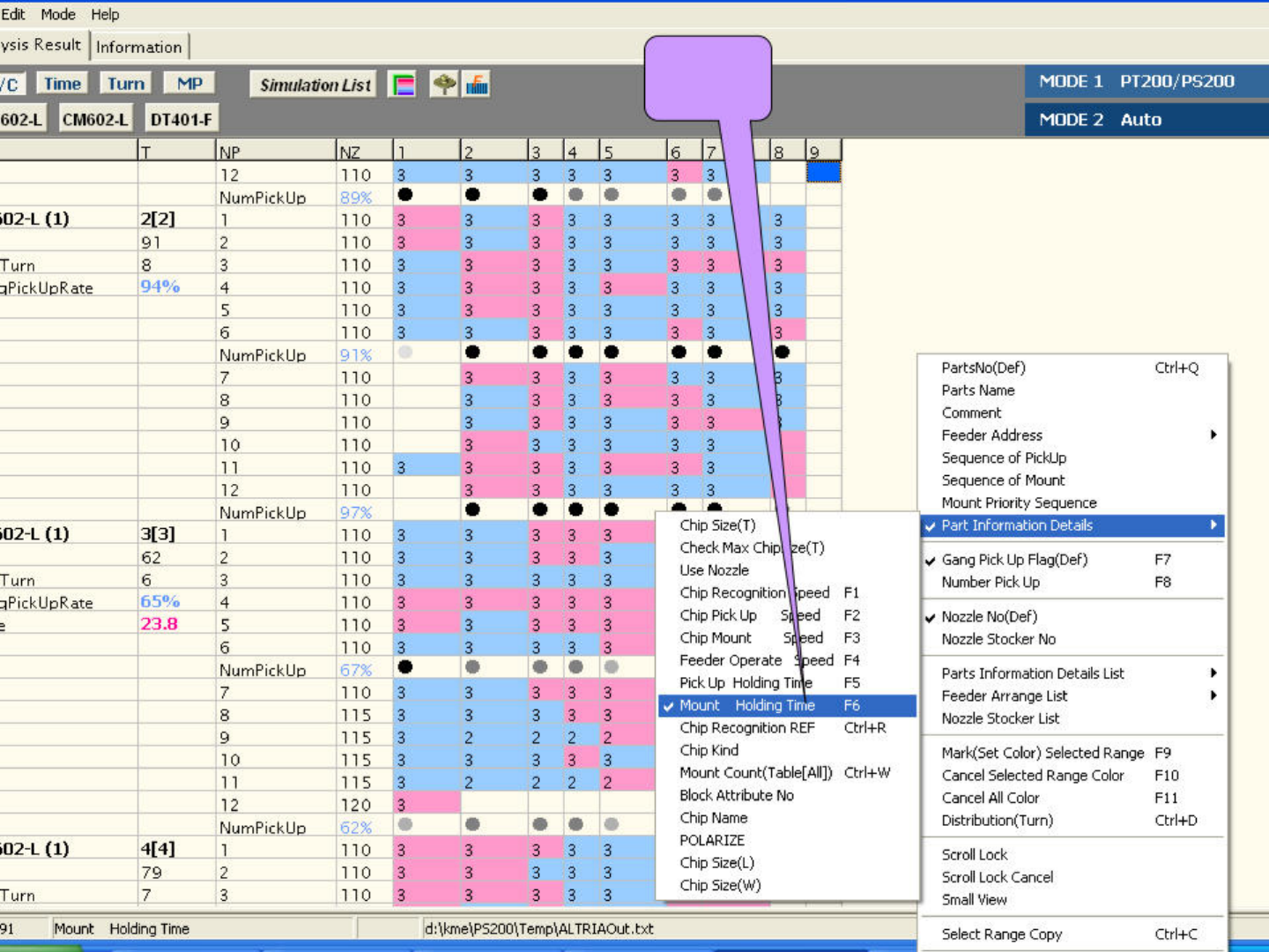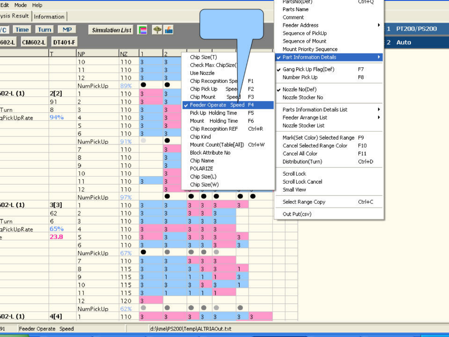 元件 feeder 速度 Edit Mode Help vsis Result Information Simttf-atim LKl i min T 12 no , 02-L (1) 91% Ctrl+W •• NumPickUp 97% Select Range 匚 opy Ctrl+C iO2-L (1) Out Put(csv) 6 110 NumPickU 口 67% 7 no 3 8 115 12 120 iO2 L (1)…
