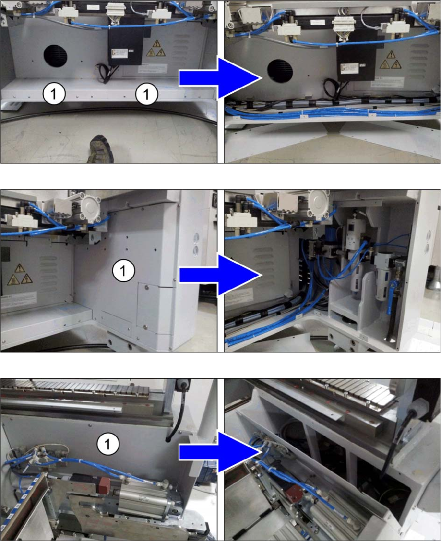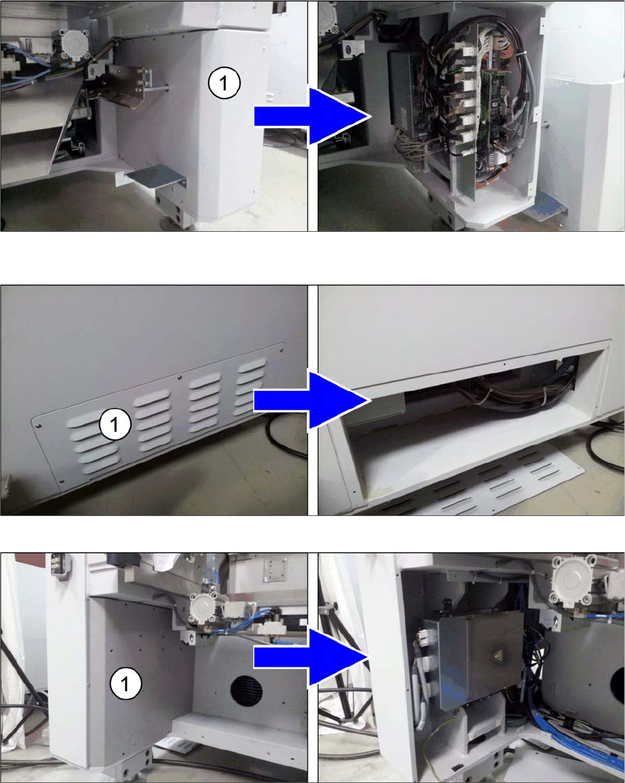 ► Remove the metal covers (1) at the bottom on the movable table side of the machine.