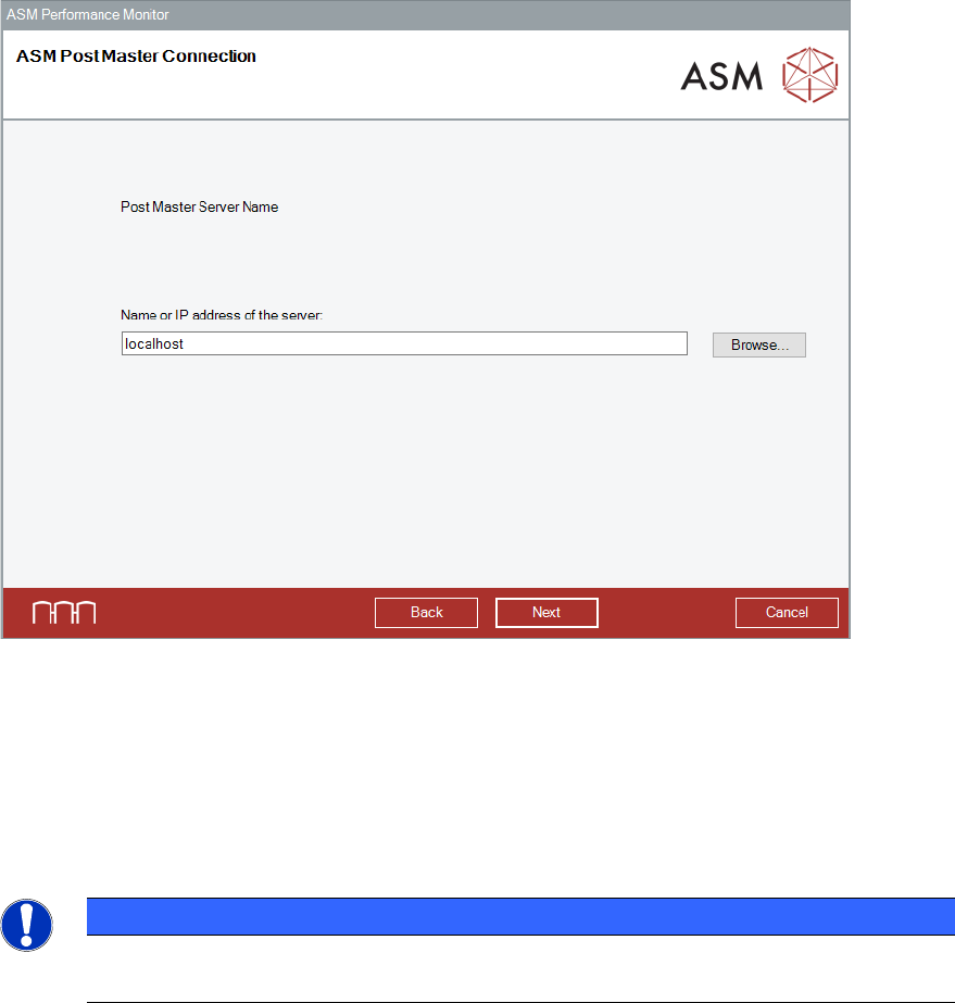 ASM Performance Monitor 2.1 / Installation Manual 01/2021 Edition 23 4.7 Specifying ASM Post Mast er Configuration Figure 4- 11 : ASM Post Master C onnection dialog ► Enter the IP address or t he hostname of ASM Post Mas…