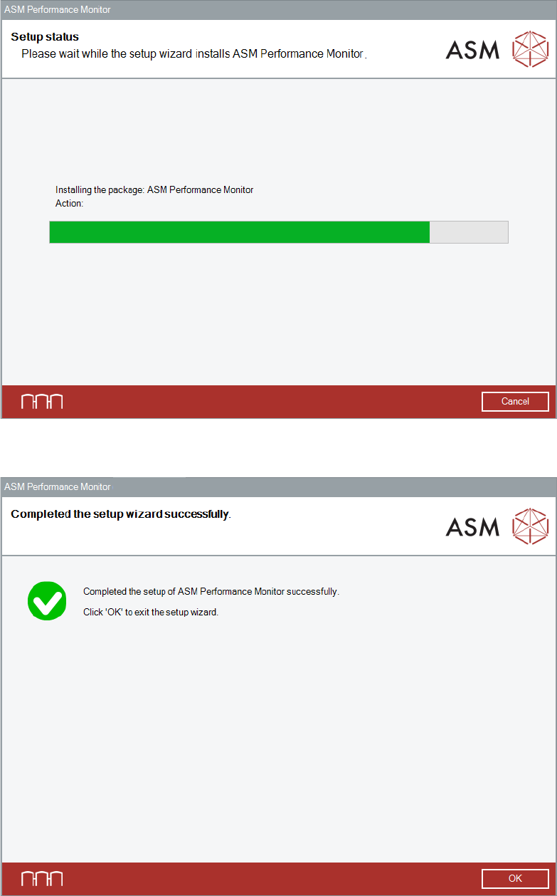 ASM Performance Monitor 2.1 / Installation Manual 01/2021 Edition 36 Figure 4- 27 : Setup status dial og After successful installation , the following dialog is displayed: Figure 4- 28 : Setup succes sfully completed dia…
