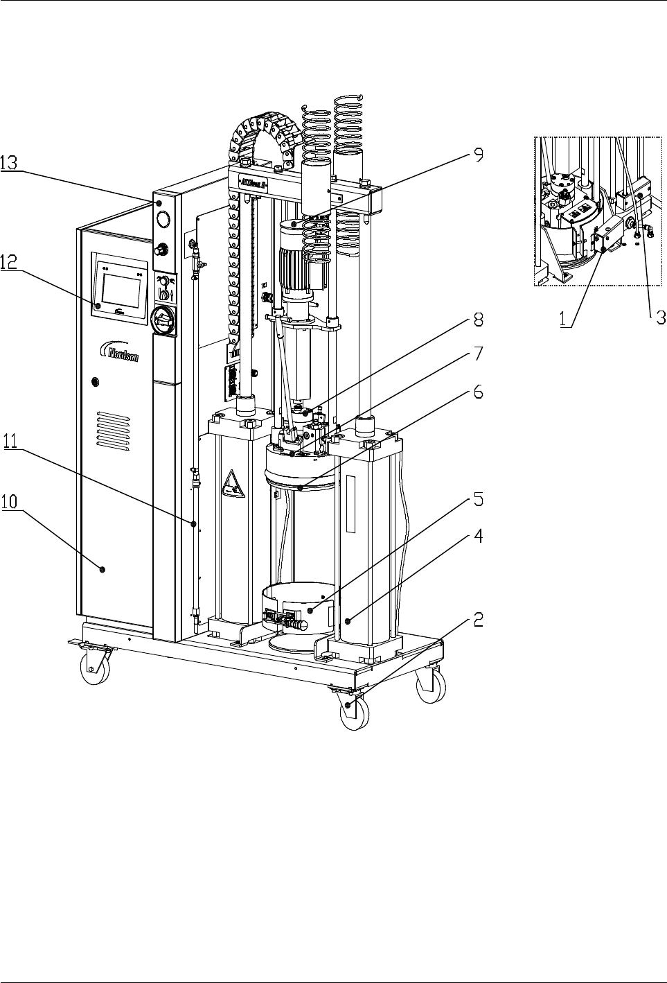 Parts 1 1 -3 Part 1121836_03 E 1 1/2014 Nordson Corporation Assembly Overview 19 Figure 11-1 1. Device, container d etection 2. Castors 3. Device platen p osition inquiry 4. Pneumatic cylinder D160-520 5. Pail clamp 6. M…