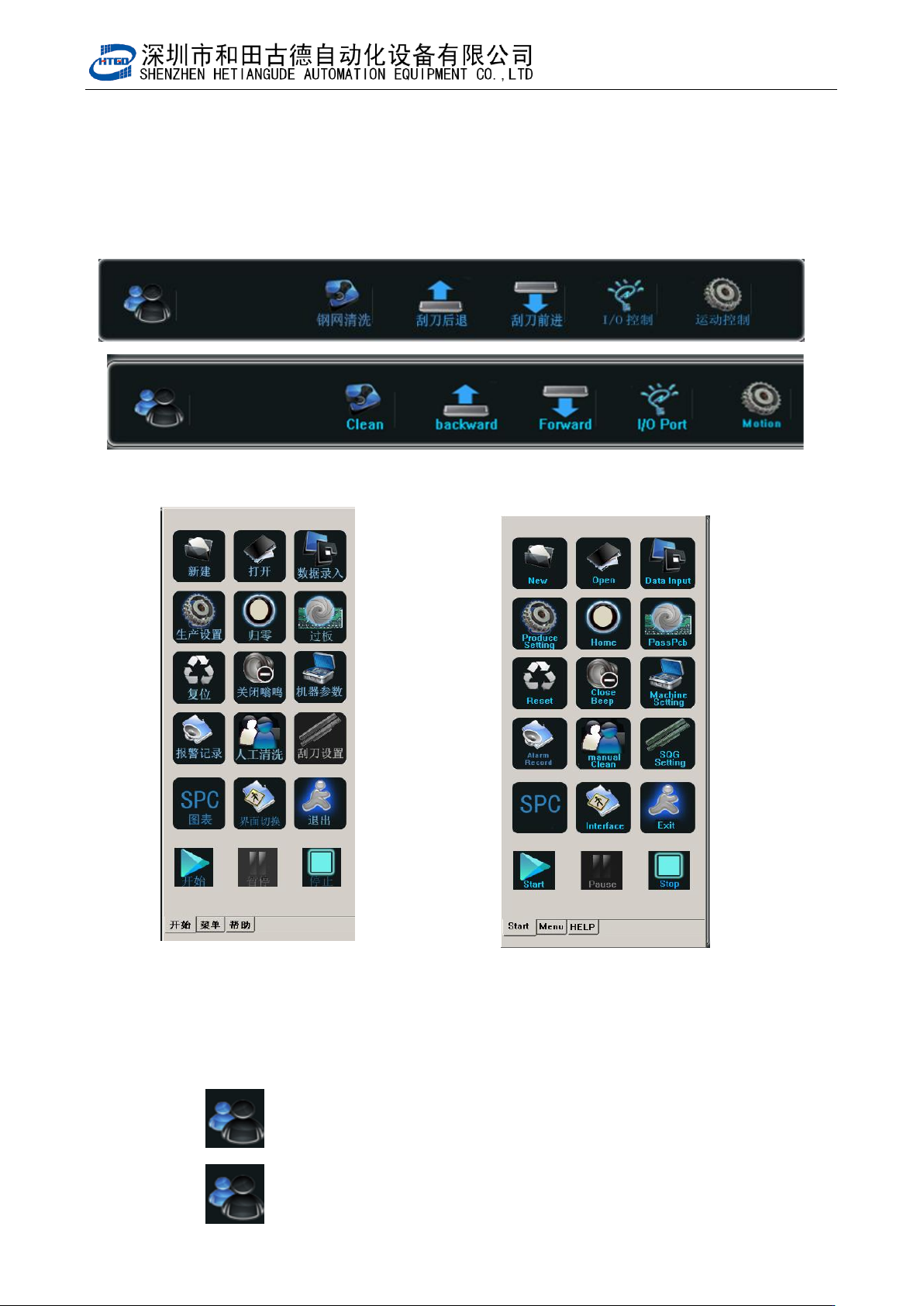 - 53 - 第四章 操作系统说明 Chapter 4 Introduction of the operation s ystem 4.1 系统启动 Sy s tem st art- up 打开机器主电源开关,将自动进入主窗口画面。操作程序如下: 打开总电源开关 打开气源开关 打开机器主电源开关 进入机器主画 面(主菜单) T urn on the main power switch and enter into th e main w…