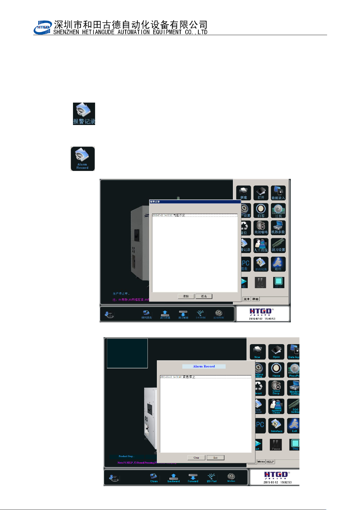 - 6 5 - Pix 4-9(printer parameter 3) Pix 4 -10(printer p arameter 4) 10 : :报警记录按钮。单击该按钮后如图 4- 11 ; : Alarm record. The i n terface in the pix 4 -1 1 will be displa yed by clicking this button. 图 4- 11 (报警记录)