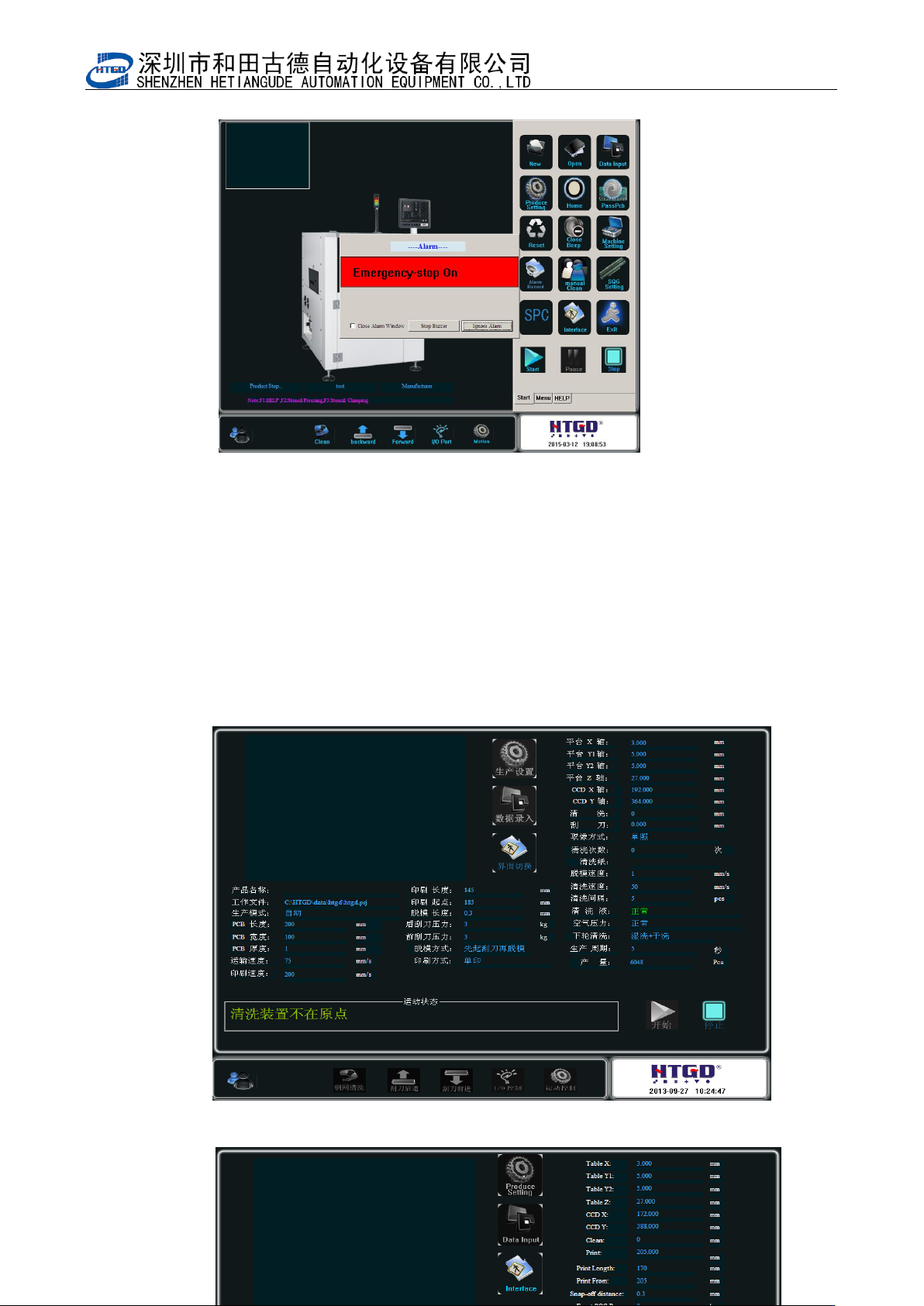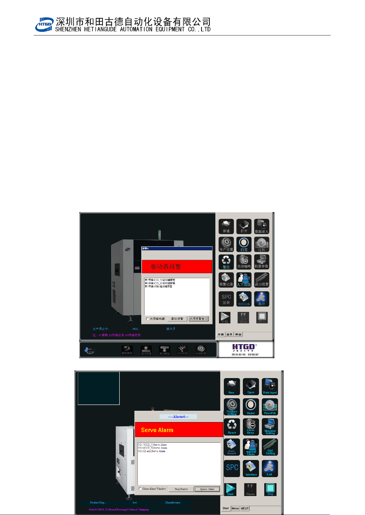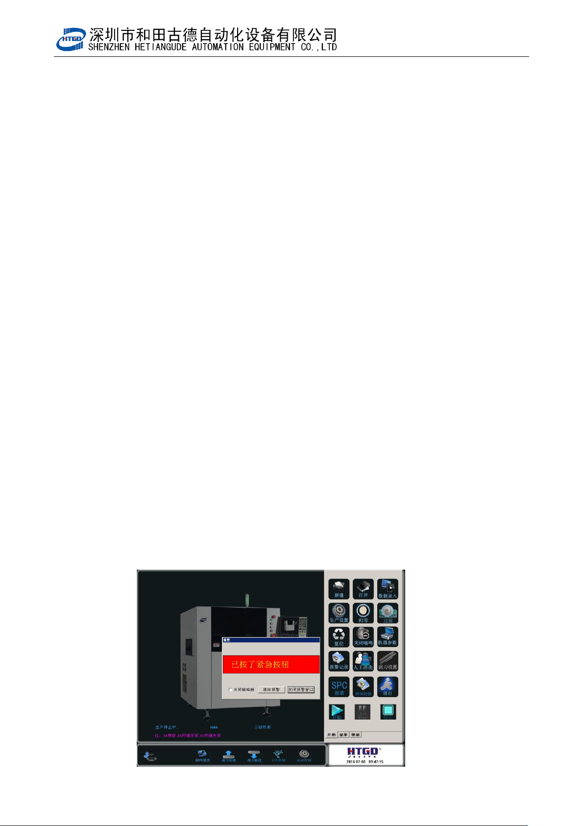 - 7 7 - 图 5-2 (紧急按钮按下时报警) Pix 5-2(the s ystem alarms after pressing the em ergent button) 3 清洗装置不在原点报警,如图 5-3 所示 The system will a larm when the cleaning device is not at its position. S ee pix 5- 3. 该状况是清洗架不在原点导致的,请打开机器…