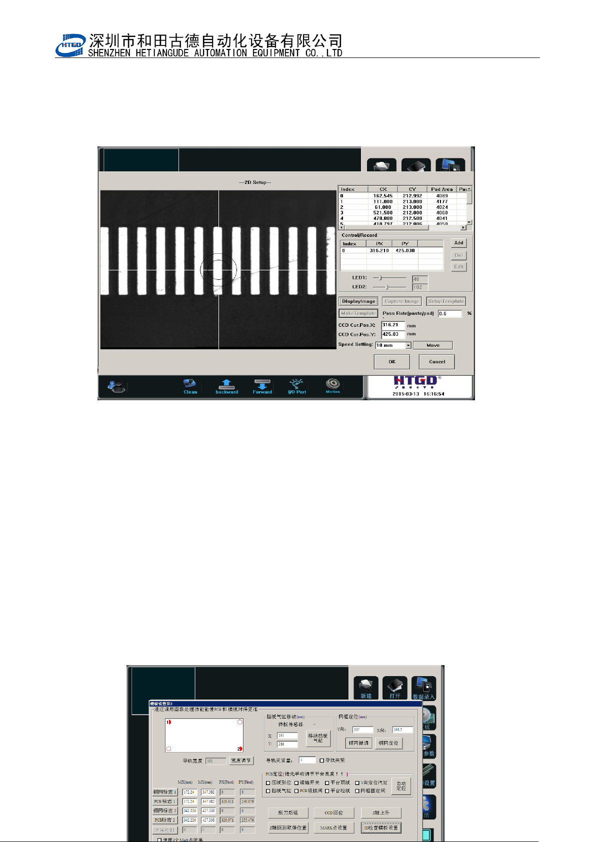 - 9 0 - 图 6-6 (设置检测点) Pix 6-6(setup the inspection spot) 7. 点击定置模板后, 如图 6-7 , 显示检测点序号和坐标。 如果还有需要设置检测点, 则点 击增加记录,进行如上第三步以后的操作。 After clicking “ 定置模板 ” (temp late customization) button, it will show the item and positionin…