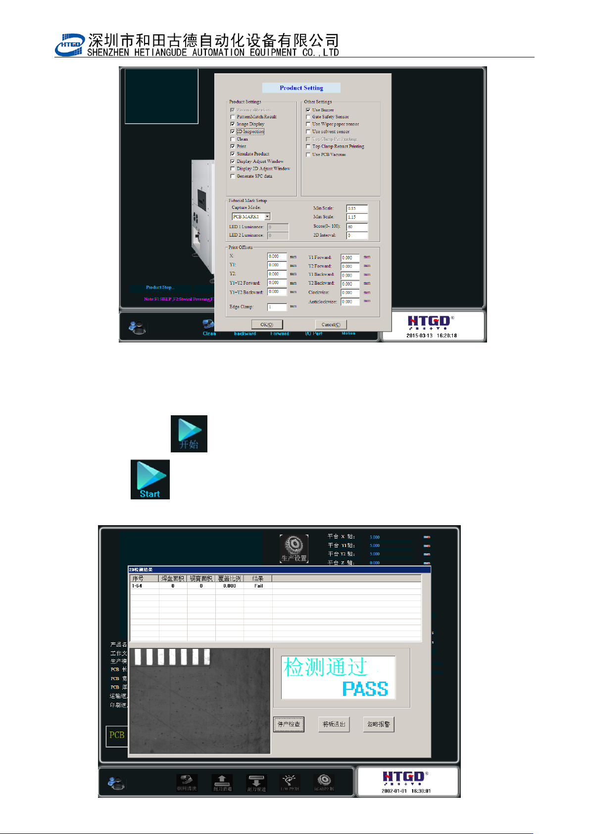 - 9 3 - Pix 6-9(production setting interface) 12 点击开始按钮 进入生产状态。印刷完成后,显示检测界面。 Click “ ” ( st a rt) button to start production. The inspection interface will displa y after the printing has been finished.