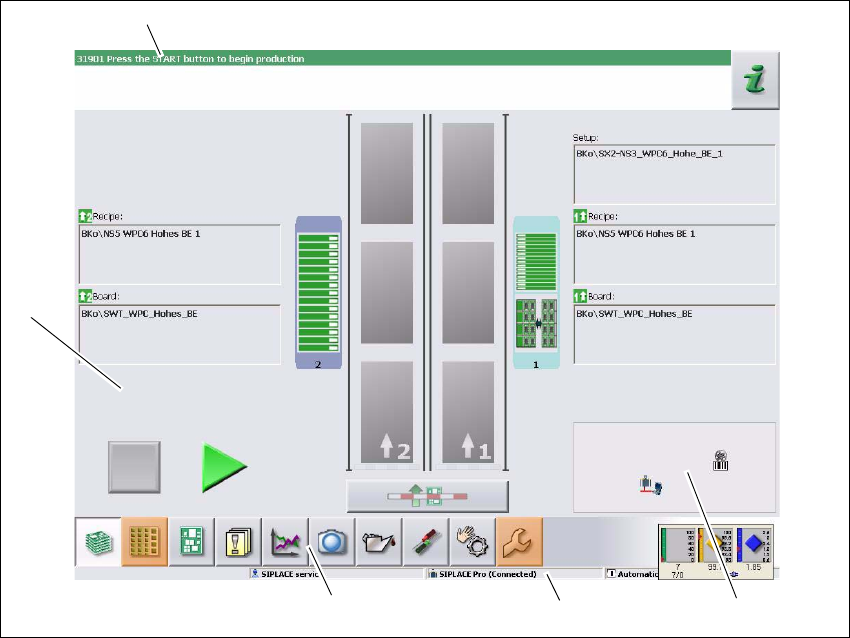 Ábra 5.5 - 1 A kezelőfelület komponensei "Gyártás" nézetben (a SIPLACE SX példáján)