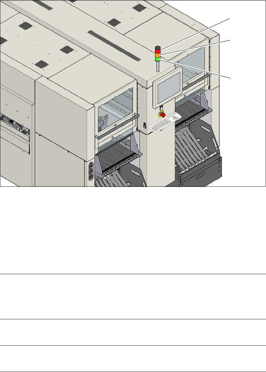 5 Feladatok a gépen Üzemeltetési útmutató SIPLACE SX4/DX4 5.7 Jelz ő lámpák Az SR.706.xx szoftververziótól Kiadás: 06/2012 HU 260 Az automata a Stopp-gombba l meg lett állítva; A termelés foly- tatásához a Start-nyomógom…