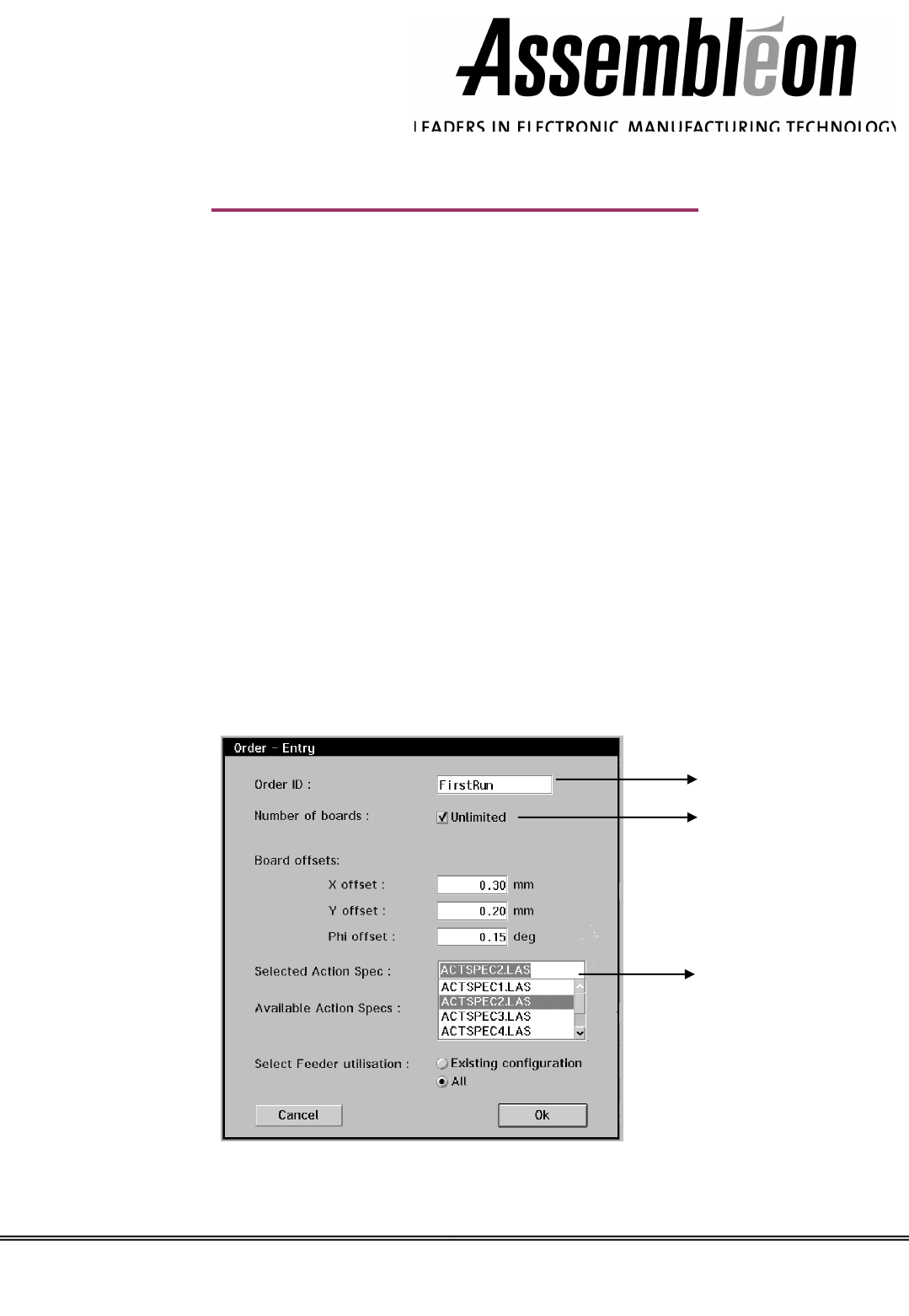 輸入新 的生產 訂單 • 選擇 “ Order” 目錄中的 “ Entry”, “Order 框將會出現 . • 輸入下列資料 : – 輸入一個生產訂單的名稱 – 輸入此訂單所欲生產的 – 選擇所需的 Action Spec 式 , 請通知管理員 . – 選擇 [OK] 或按下 < Enter> 註 : 在任 何時間 按下 [Cancel] 或 一切資 料 . FCM 操作訓練手冊 \\Operator-FCM.PPT 一切…