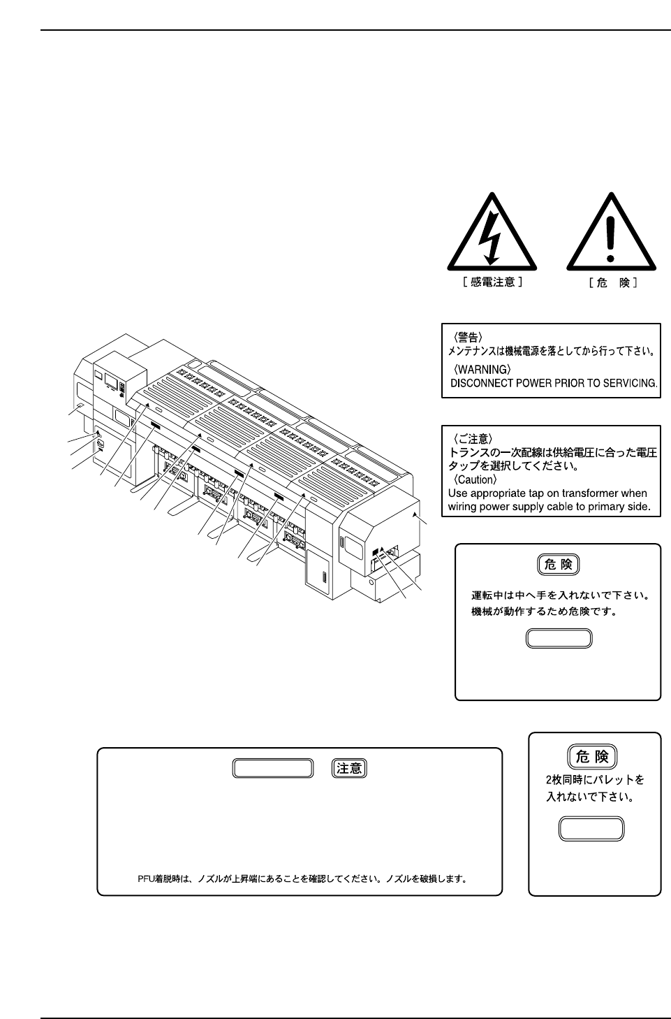 6. Safety Labels To warn the operator of hazards, safety labels are attached to the machine at the positions indicated in the figure below. Familiarize yourself with each label and its message before operating the machin…