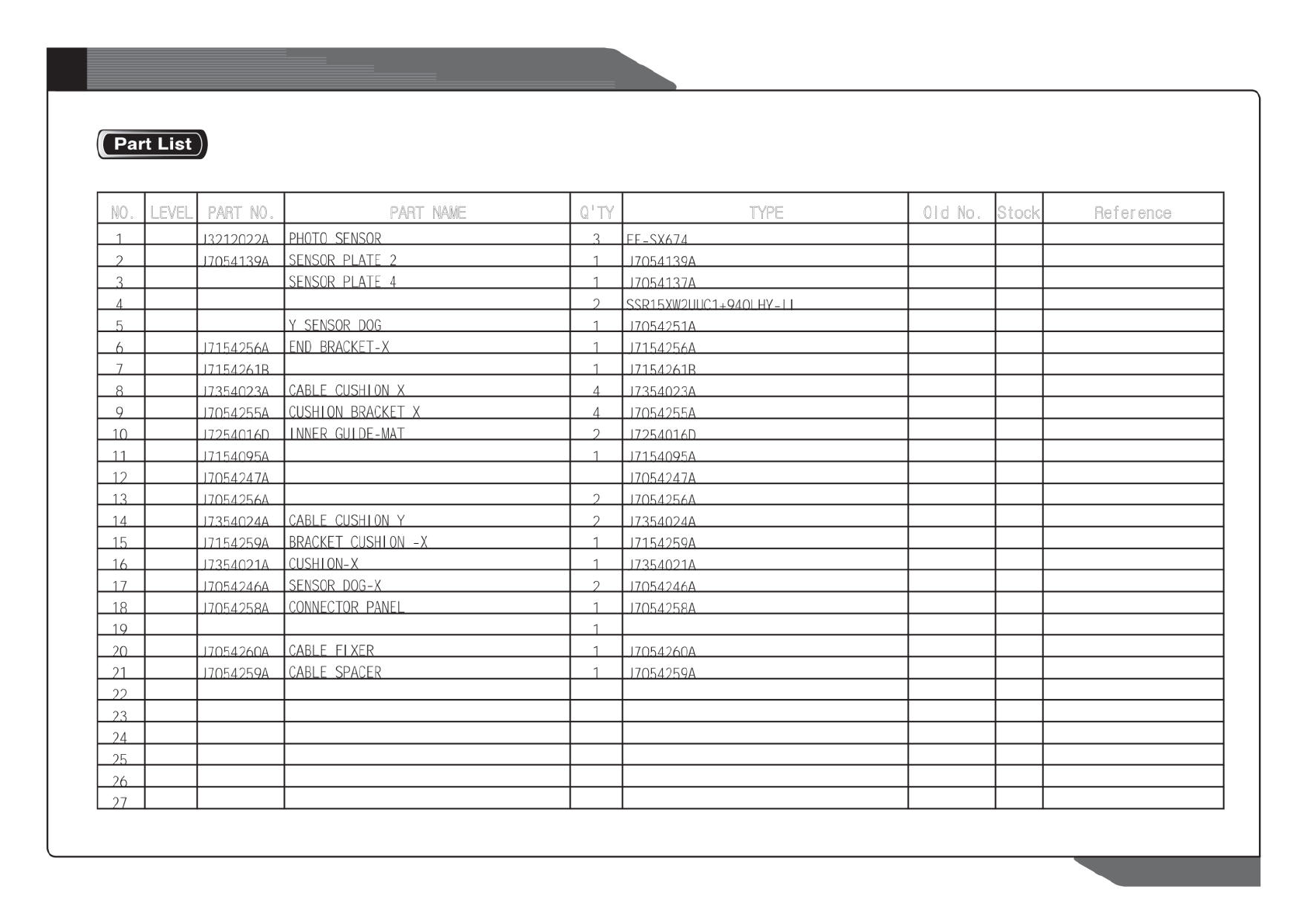 NO. LEVEL PART NO. PART NAME Q'TY TYPE Old No. Stock Reference