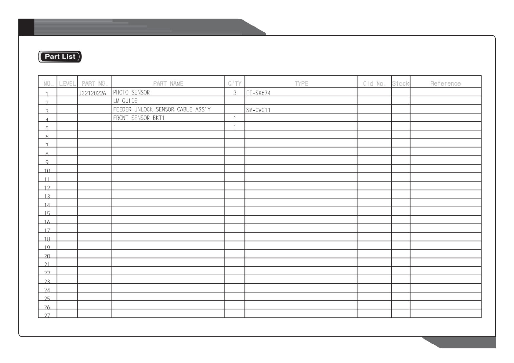 NO. LEVEL PART NO. PART NAME Q'TY TYPE Old No. Stock Reference