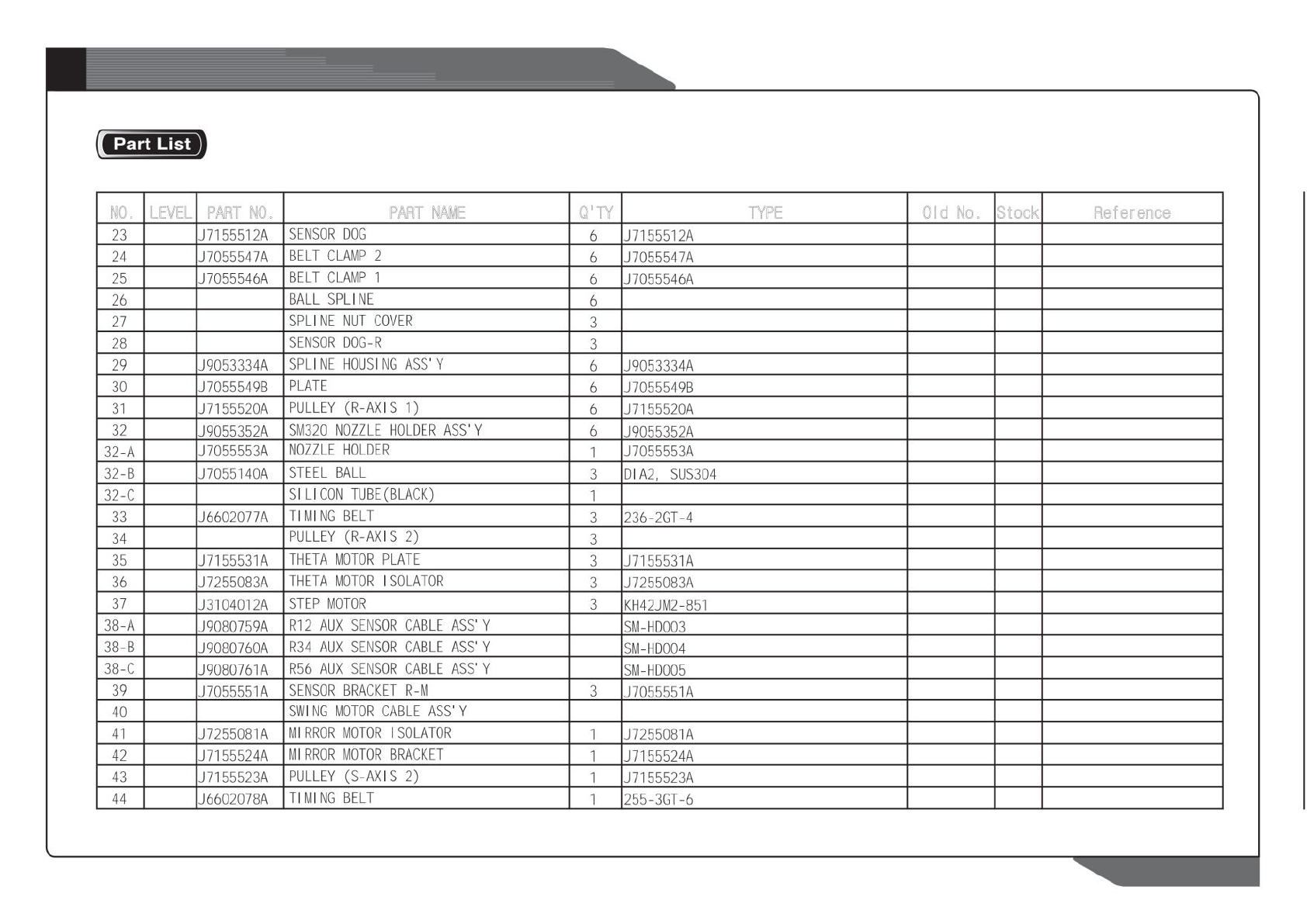 NO. LEVEL PART NO. PART NAME Q'TY TYPE Old No. Stock Reference