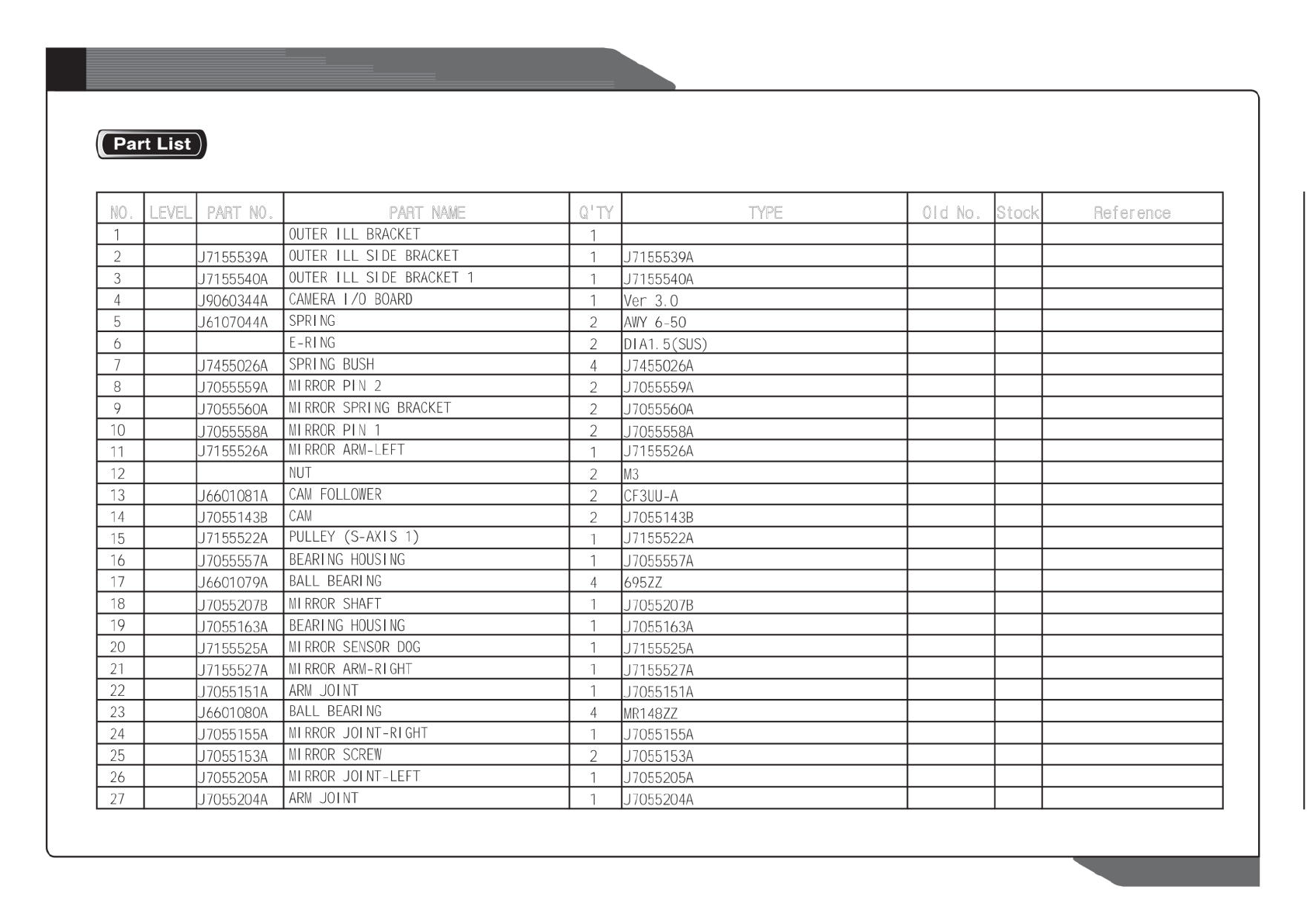 NO. LEVEL PART NO. PART NAME Q'TY TYPE Old No. Stock Reference