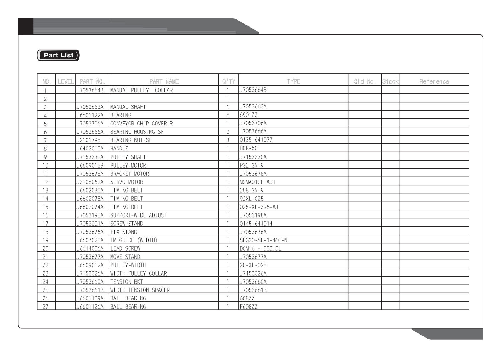 J6609012A J7153325A PULLEY WIDTH J6609012A E xitConveyorAss'y 6 9 Page SAMSUNGTECHWIN NO. LEVEL PART NO. PART NAME Q'TY TYPE Old No. Stock Reference 「 art Lisf) NO。 LEVEL PART N0o PART NAME Q'TY TYPE …