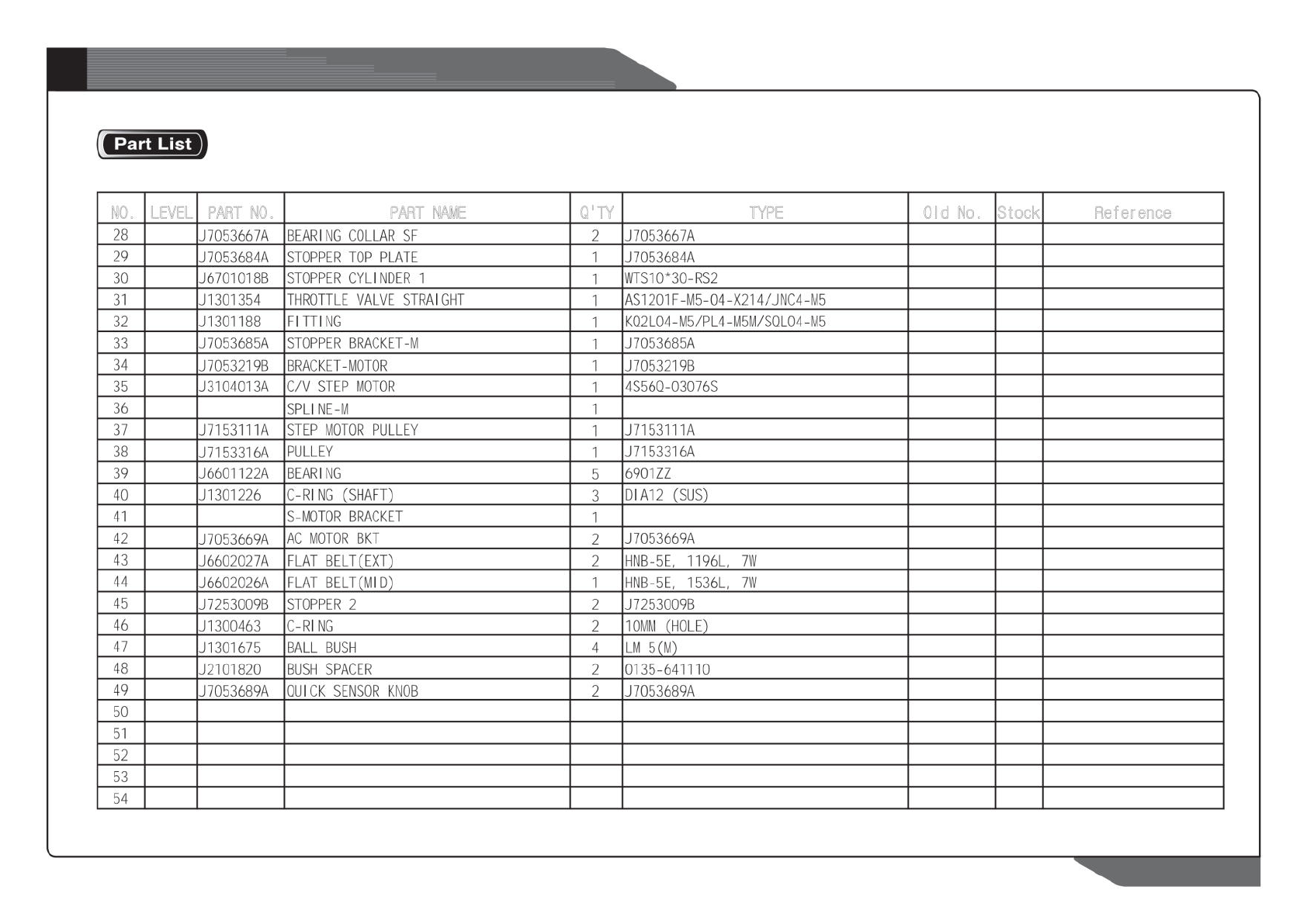 NO. LEVEL PART NO. PART NAME Q'TY TYPE Old No. Stock Reference