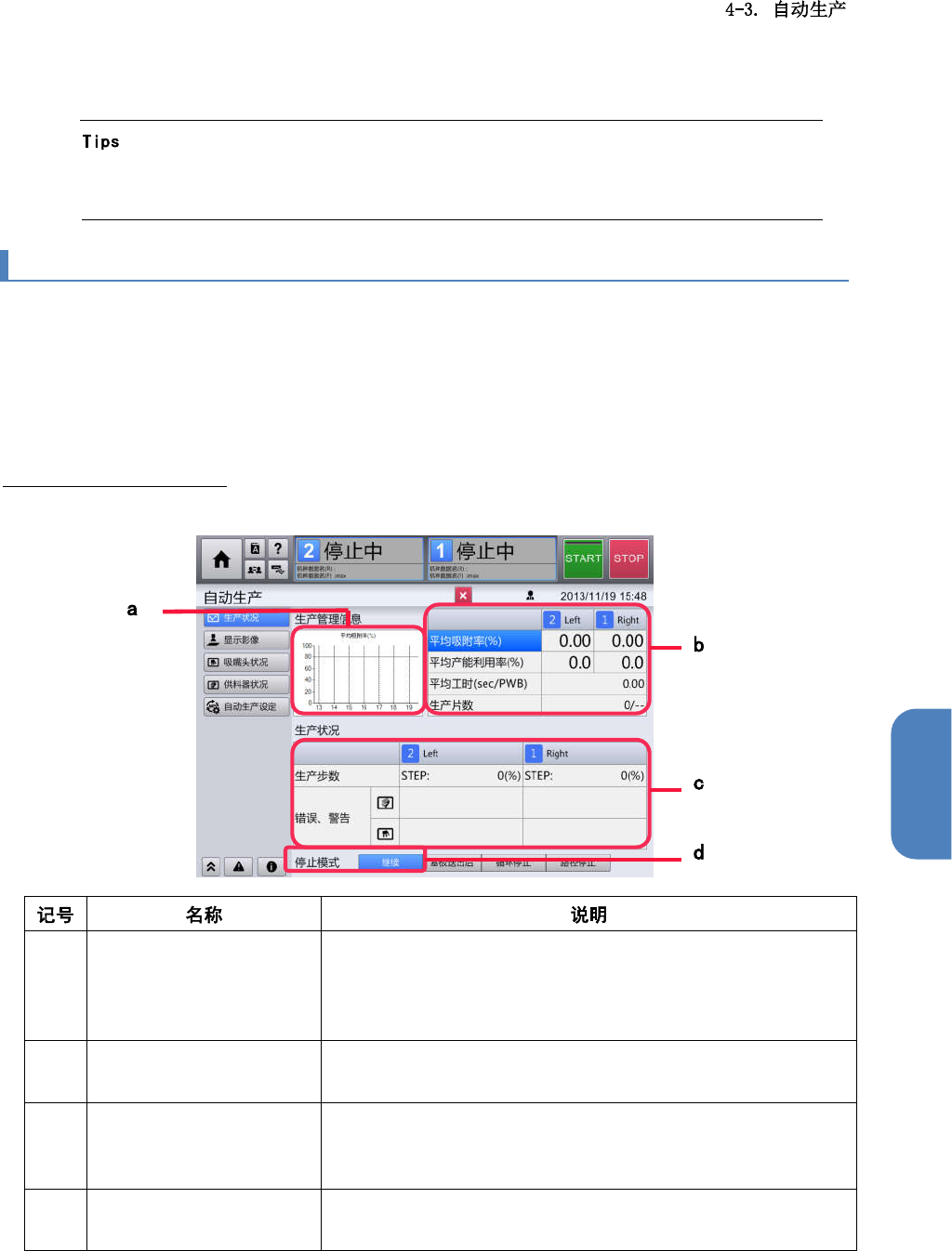自动生产菜单中,除了可进行自动生产的开始,停止动作之外,还可确认不同生产状况下本机的各项运