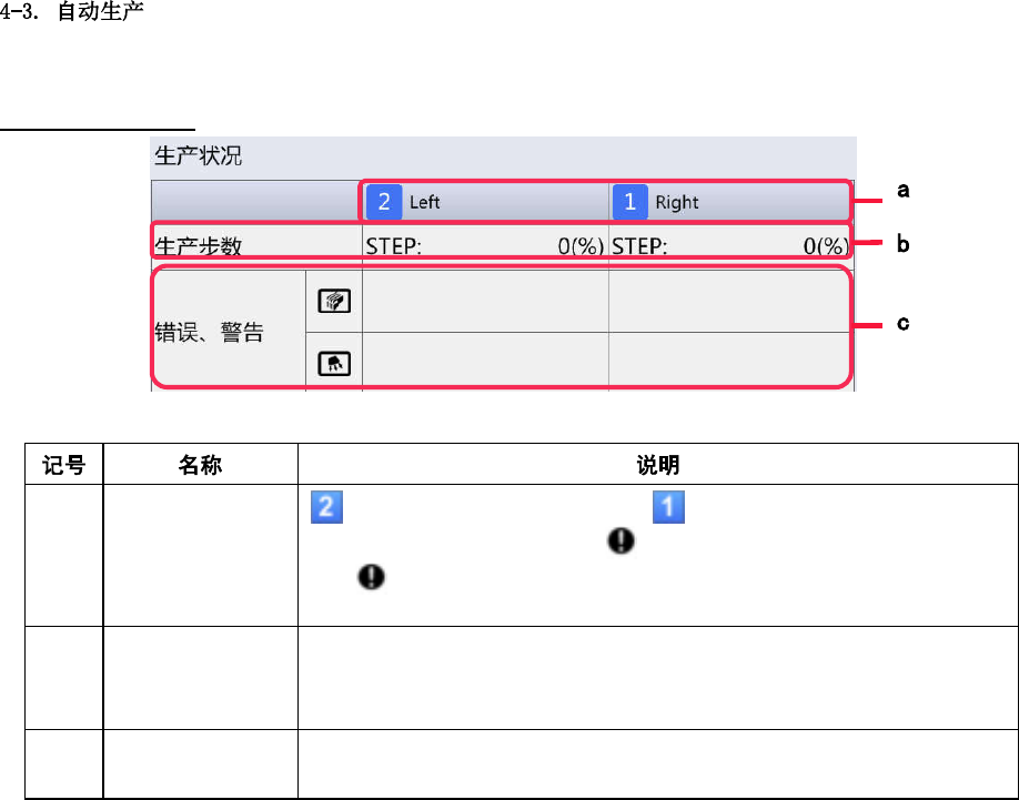 第 4 章 操作篇 错误,警告的显 示 (a) 装 置显示 [ Left ]表示装 置 2 (左侧) , [ Right ]表示装置 1 (右侧)。 装置在降级运行 * 状态时,显示 。 触摸 后,将在[缩退运行信息 ※]对 话框中显示当前的降级运行 状 况。 (b) 生 产步数 通过右侧的数值 和进度 条,显示正在生产的 机种中已经完成安装 的生产 步骤的进度比例 。 用前后轨道生产 时,分 2 行分别显 示生产步骤进 度。 (c) …