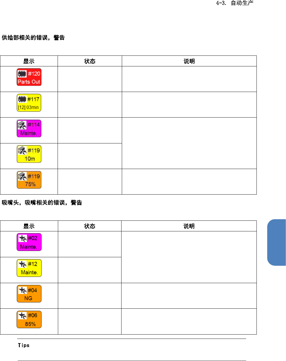 吸嘴头,吸嘴发生错误,警告时,将显示以下图标。