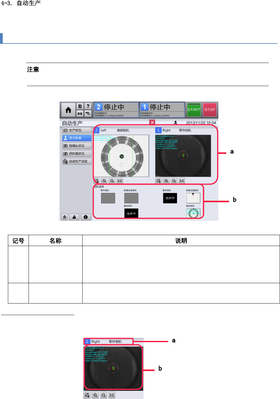 第 4 章 操作篇 4-3-4. 相机显示 触摸[自动生产]画面 子菜单面板中 的[显示影像 ],可显示[显示影 像]画面。 • 如果在[显示影 像]画 面状态下生产,节拍 时间会降低。 (a) 选中相机的显 示,操作 放大显示相机选 择区域 ( b) 中选择的相机图像。 装置 2 的相机信息 显示于左侧,装置 1 的相机信息显示于右 侧。 此外,针对选中 相机的 图像(识别结果), 进行拖动模式的切换 / 放大 / 缩小 / 画面尺寸…